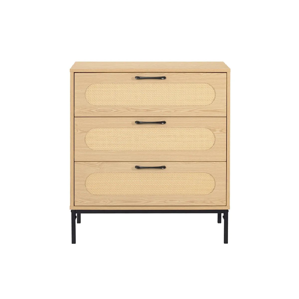 Commentaire vendeur : Caractéristiques techniques :Origine : AsieGarantie : 2 ansType de produit : CommodeSystème d'ouverture Push : NonNombre de tiroirs : 3Produit recyclable : MajoritairementMatière de la structure : Panneaux de particulesMatière : Panneaux de particulesDétail des matières : Matières principales : Panneaux de particules – Finition : Satinée – Pieds avec bois et poignées en métal - Poids maximum supporté : 55 kg - Résistant à l’humidité et aux rayuresCharge maximum : 55Finition : SatinéePieds : métal noirMatière poignées : MétalEpaisseur panneau : 15Poids : 26Style : ContemporainPrésentation de la marque : Canapé, buffet, vitrine, meuble TV, bureau, console ou table de salon, Best Mobilier vous propose une gamme de meubles d’intérieur au design attractif et au prix juste dans un style moderne, industriel ou scandinave.Collection : NAGATOPrésentation de la collection : La collection Nagato combine élégamment façade en cannage arrondi, poignées en métal et charme vintage, offrant des rangements pratiques et un montage facile.Nombre de colis : 1Dimensions du produitHauteur : 77 cmLargeur : 70 cmProfondeur : 39 cmHauteur des pieds : 18 cmDimensions des colisNombre de colis : 1Colis 1 : L48xP84xH22 cm (27 kg)Recommandations d’entretienDépoussiérez régulièrement. Nettoyer les salissures légères avec un chiffon humide et séchez directement. De manière générale, ne laissez pas de liquides stagner sur la surface du meuble pour éviter to...