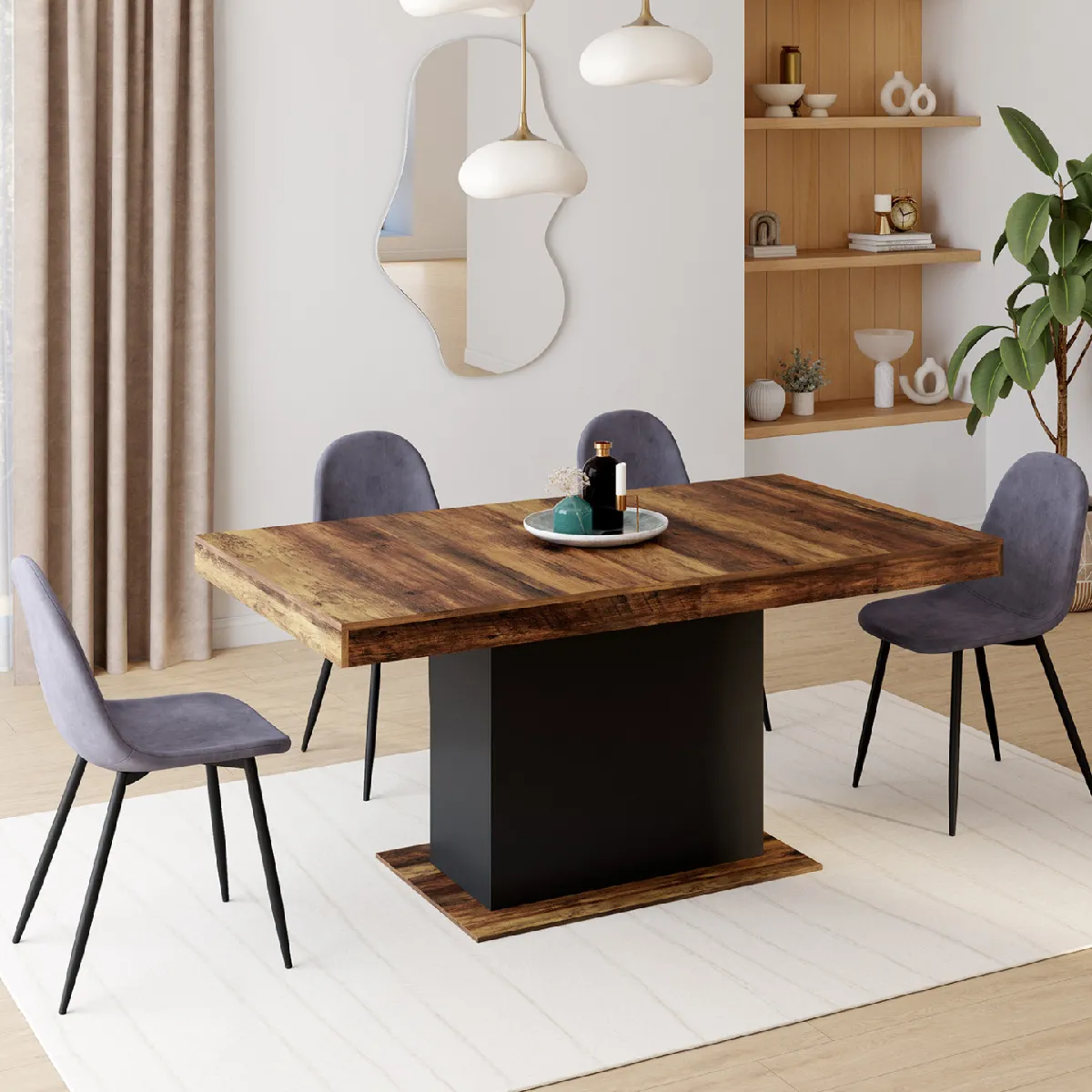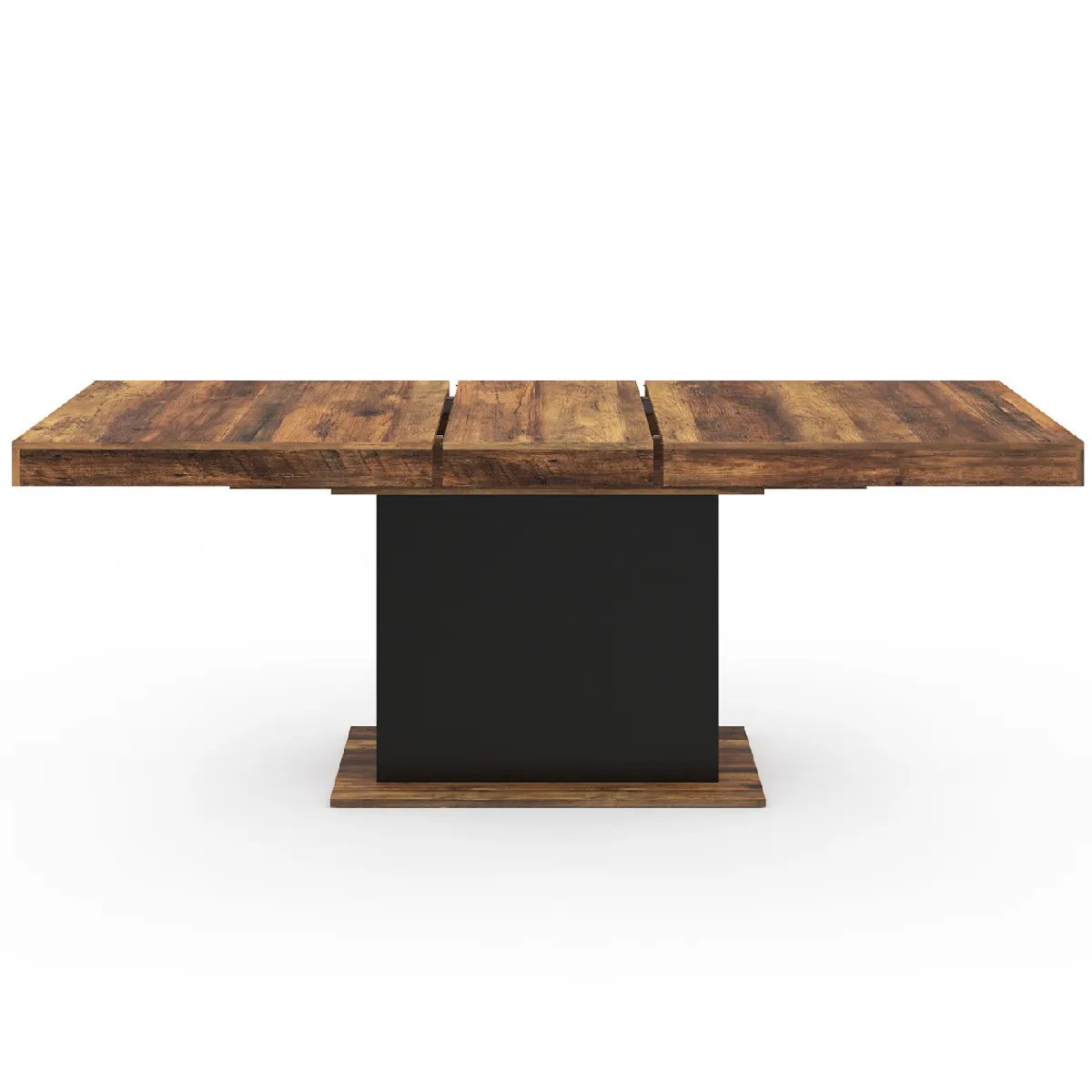 Vous avez une famille nombreuse ? Vous aimez recevoir vos proches ? Préparez de bons repas et partagez-les sur une table de salle à manger au design industriel vintage. Avec son pied central noir et son plateau bois foncé effet vieilli HAWKINS, la table de repas EDEN s'intégrera parfaitement à votre intérieur en lui apportant un esprit authentique et design !Repas de famille, soirée conviviale entre amis... la table à manger extensible 6-10 personnes s'adapte à vos événements pour un moment convivial ! Grâce à son extension de 40 cm, passez en un rien de temps à un plateau de 200 cm de long pour accueillir toute la famille. Vous n'êtes que 6 ce soir ? L'extension se range discrètement sous le plateau, pour rester toujours à portée de main.Avec son pied central et son grand plateau épais, la table EDEN en bois foncé et noir HAWKINS est d'une grande stabilité et très robuste. Grâce à ses dimensions généreuses, cette table rectangulaire 160/200 cm x 90 cm vous permet d'accueillir de nombreux convives pour de merveilleux moments de partage.Cette table en bois foncé et noir à l'aspect massif sera la pièce phare de votre salon ou salle à manger. La combinaison des coloris bois foncé effet vieilli et noir est une association parfaite pour apporter un look industriel et tendance à votre salle à manger. Son style lui donnera un aspect vintage qui s'adaptera à toutes les décorations.Dimensions de la table de salle à manger extensible EDEN plateau HAWKINSDimensions globales : Longueur 160-200 cm x largeur 90 cm x Hauteur 75 cmHauteur des rebords du plateau : 8,5 cmDimensions du pied central : L. 69 x l. 32 cmDimensions du socle : L. 86 x l. 54,6 cmMatériaux : panneaux de particules mélaminésCapacité : 6 à 8-10 personnesColoris : Bois foncé et noirÀ monter soi-mêmeCe modèle de la gamme EDEN existe également en plusieurs coloris :- Bois et noir- Bois et blanc- Bois effet vieilli et noir- Béton et blanc- Bois noir et bande centrale noire- Bois et effet béton Retrouvez l'ensemble de notre collection moderne sur notre boutique en ligne !