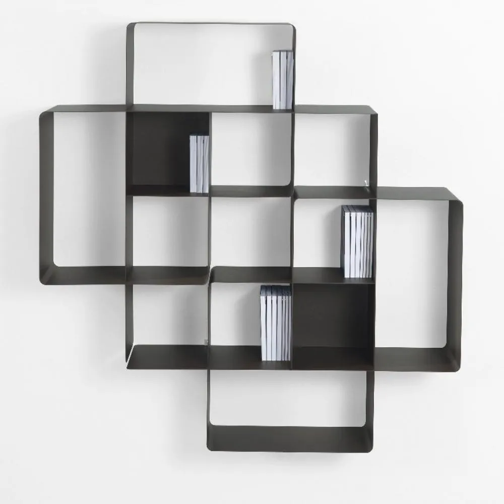 La structure modulaire offre une organisation claire pour les livres et objets tout en occupant un faible encombrement au sol. Réalisée en feuille d'acier colorée sablée, cette bibliothèque forme un ensemble stable et géométrique, adapté aux intérieurs sobres et contemporains. La composition regroupe deux modules de même couleur gris ardoise, permettant une symétrie visuelle et des alignements nets. Le montage peut se faire horizontalement, verticalement ou en diagonale selon l'espace et l'usage. Les dimensions L148 x H148 x P22 conviennent à un pan de mur standard, avec une profondeur pensée pour des ouvrages courants et des objets décoratifs.