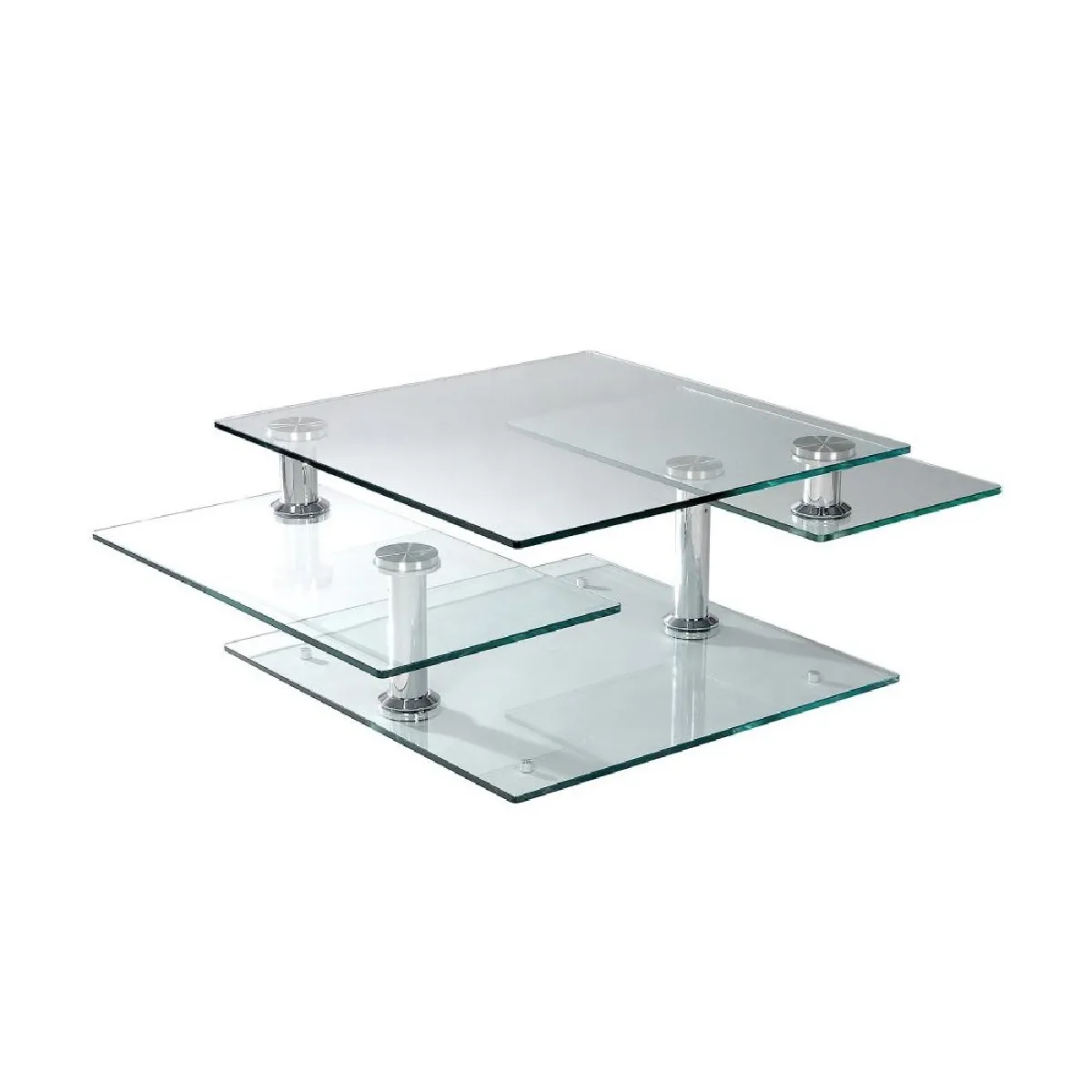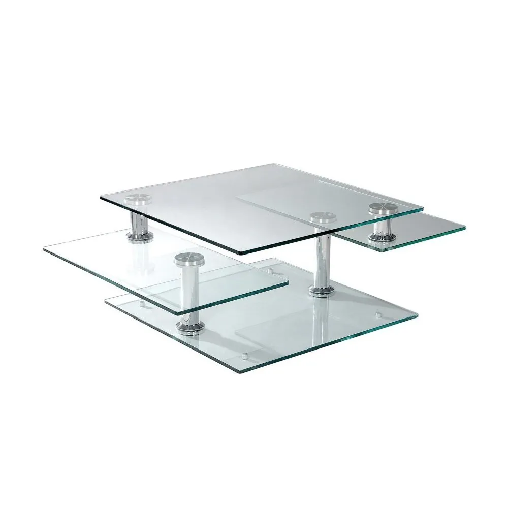 Le plateau supérieur mobile permet de passer d'une configuration carrée à une surface rectangulaire plus généreuse pour accueillir magazines, télécommandes et plateaux. La structure associe verre trempé de 12 mm et éléments métalliques pour une stabilité fiable, adaptée aux salons contemporains. Le mécanisme de rotation offre une manipulation fluide, sans outils, pour ajuster l'espace selon la situation. Les proportions de 42 cm de hauteur favorisent une utilisation confortable devant un canapé. L'esthétique transparente allège visuellement la pièce et laisse circuler la lumière, tout en préservant une ligne moderne compatible avec des décors épurés.