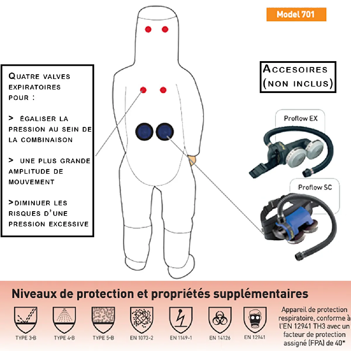 . La combinaison MICROGARD 2500 PLUS offre une protection avancée contre les produits chimiques liquides et les particules. Elle est conçue pour être utilisée avec l appareil respiratoire à purification d air Scott Proflow. Dotée de manches élastiquées et d un col SMS, elle assure un ajustement sécurisé et une respirabilité optimale. Ses quatre valves d expiration et sa visière panoramique garantissent un confort et une visibilité accrue. Les pieds intégrés avec rabat élastique permettent une utilisation facile avec des bottes. La combinaison est conforme aux normes de protection telles que EN 1073-2, EN 1149-1, EN 14126, et EN 12941, offrant une sécurité fiable dans des environnements exigeants. En conclusion, la combinaison MICROGARD 2500 PLUS est une solution essentielle pour les professionnels exposés à des dangers liquides et particulaires. Sa conception robuste, ses caractéristiques fonctionnelles et sa compatibilité avec les appareils respiratoires assurent une protection efficace et un confort optimal.