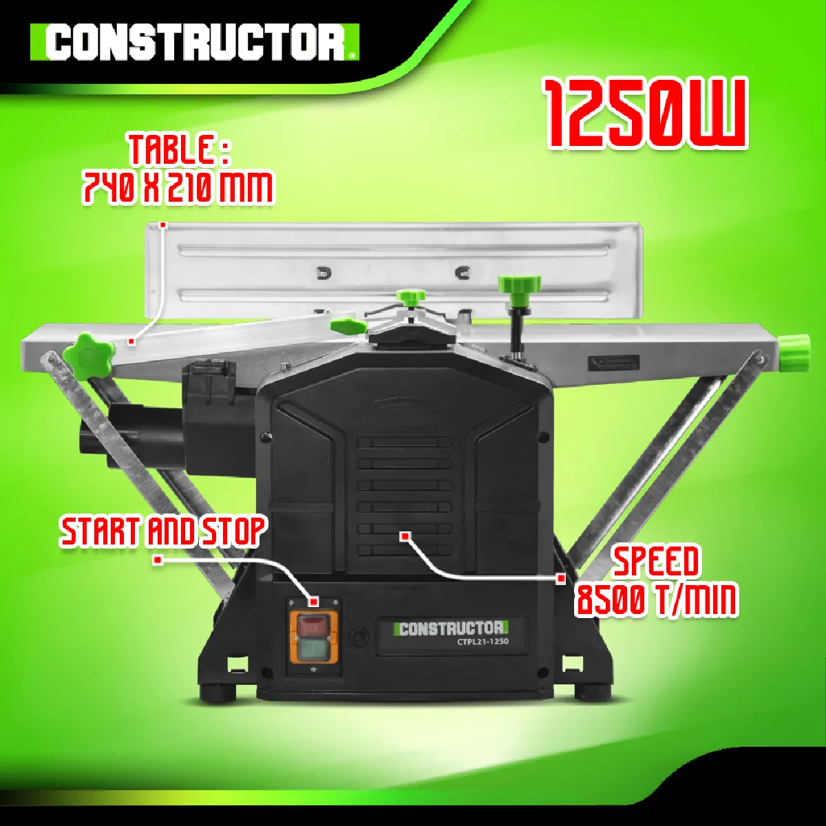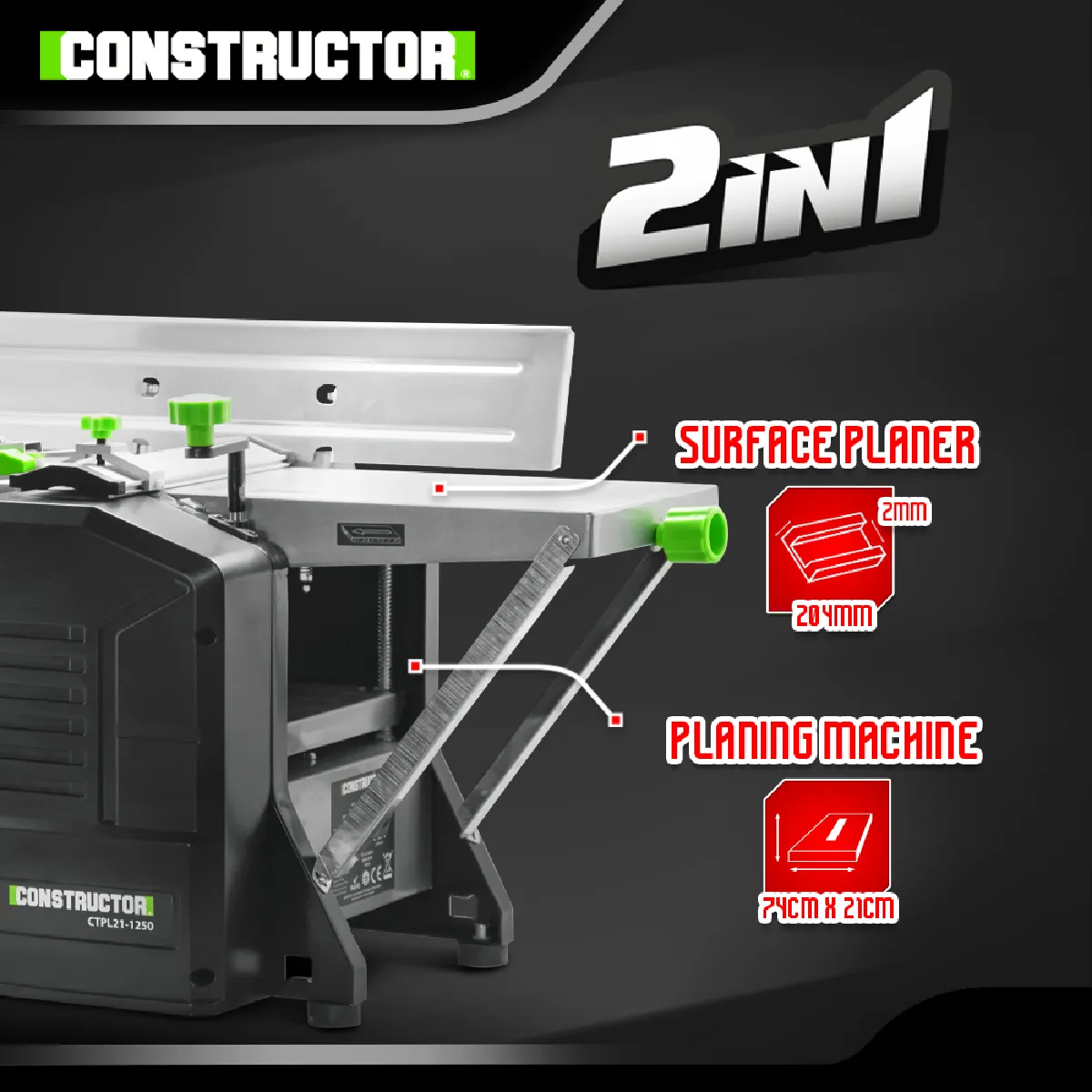 Ce combiné rabot - dégauchisseuse de la marque Constructor équipé d'un puissant moteur de 1250W vous garantira des coupes rapides et précises de votre bois (bois brut, palettes...)