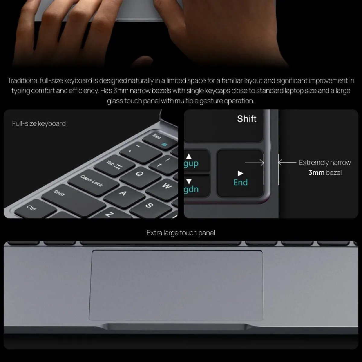 Le clavier est en disposition QWERTY, sans pavé numérique.