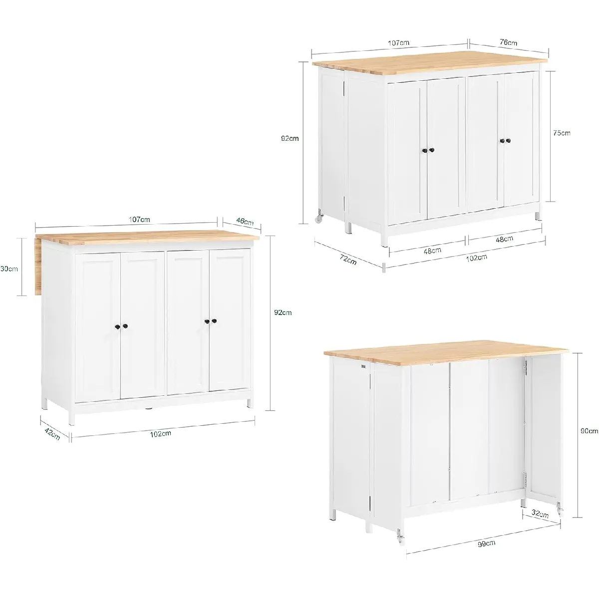 Îlot central de cuisine - Plans de travail rabattables - Buffet de rangement - 102x72x92 cm
