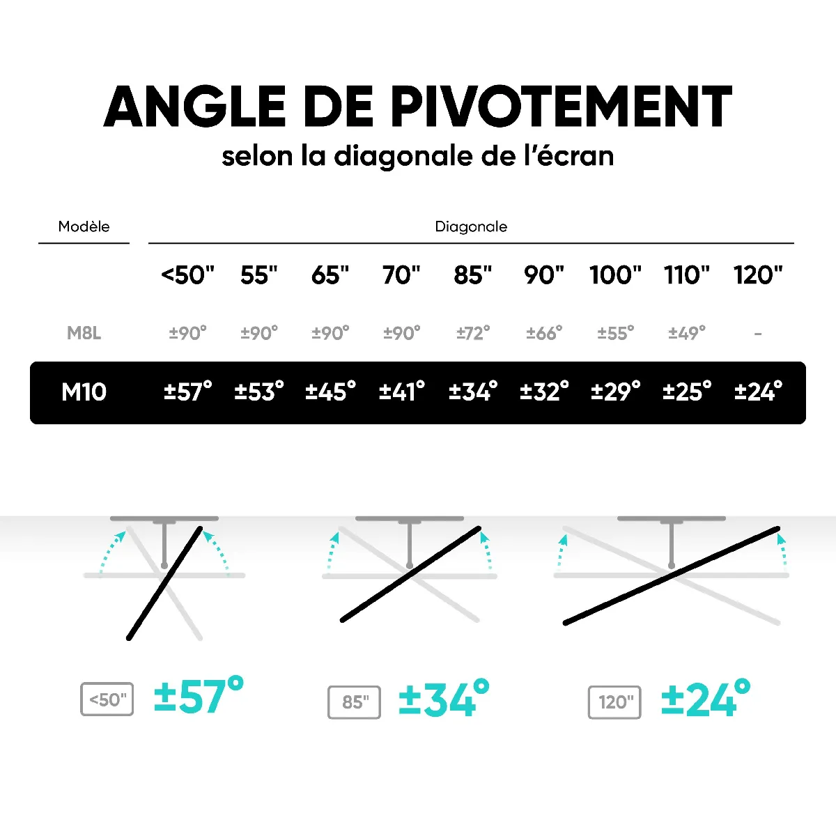 FIXATION TV MURALE | Support mural TV inclinable de +9° à -13° | Accroche TV mural pivotant à gauche et à droite de 90° | Support TV mural orientable en horizontal de -4° à +4° | Portée entre le mur et le support tele mural pivotant est réglable de 9 à 60 cm | Bras articulé TV mural est utile dans un bureau, un espace public, un magasin de détail, un établissement d'enseignement