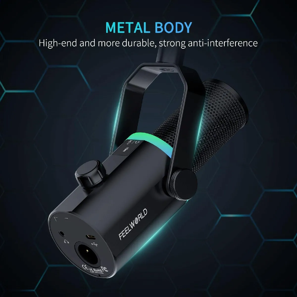 La double interface USB-C et XLR permet d'utiliser le microphone avec un ordinateur, une console compatible USB, ou un préampli/console via XLR. Le câble USB TypeC de 2 m et le câble XLR de 2 m offrent une marge de placement confortable sur le bureau. Le support en forme de U, déjà monté, et la base en métal assurent une stabilité adaptée aux enregistrements prolongés. Le format filaire évite les interruptions d'alimentation et garantit une connexion constante pour les sessions en direct.