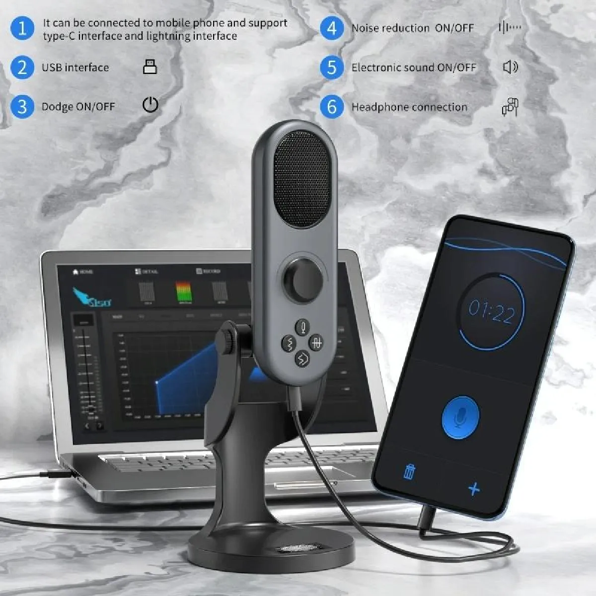 Commentaire vendeur : Microphone USB de Réduction de Bruit CardioïdeDécouvrez un Microphone haute qualité pour vos enregistrements professionnels. Ce Microphone vous offre une réduction de bruit intégrée pour un son clair et immersif.Angle de Microphone AjustableProfitez d'un angle flexible de 270 degrés, permettant d'ajuster le Microphone selon vos besoins pour des podcasts, jeux ou appels vidéo.Fonction Réverbération et Son ÉlectroniqueAméliorez vos enregistrements avec la fonction réverbération intégrée. Expérimentez avec des effets sonores électroniques pour enrichir votre contenu.Monitoring en Temps RéelContrôlez votre sortie audio grâce au monitoring en temps réel, garantissant des résultats d'enregistrement parfaits à chaque fois.Spécifications : Tension de travail 3.7-5V, réponse en fréquence 20HZ-20KHZ, interface Type-C.Caractéristiques :Marque : YonisCaractéristiques techniques :- Tension de fonctionnement : 3,7-5V- Canal audio : 2 canaux- Courant de fonctionnement : 50-100mA- Sensibilité : 25mV/Pa (-36dB+/-2dB)- Réponse en fréquence : 20HZ-20KHZ- Interface : Type-C- Dimensions : 156 x 52 x 45mmContenu du pack : - Microphone USB- Câble de connexion Type-C- Manuel d'utilisationMarque: YonisRéférence : Y-19125