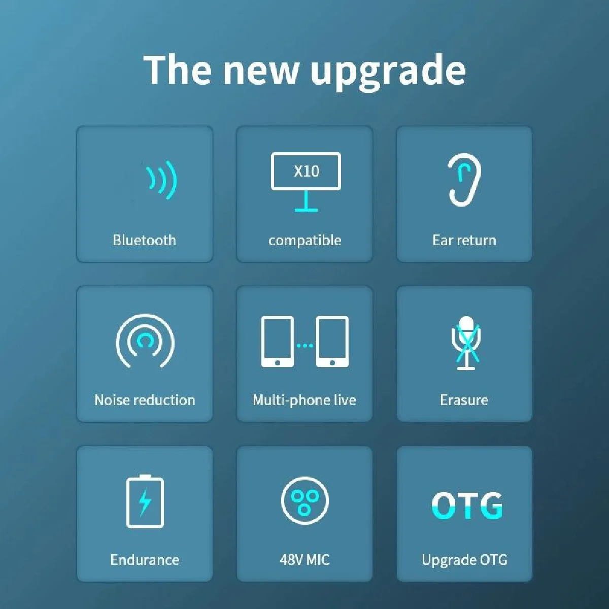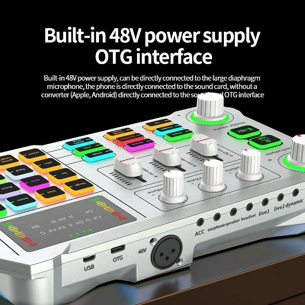 La connectique couvre les besoins du direct : port OTG pour relier un smartphone sans interface, entrée XLR 48 V pour microphones adaptés, et Audio I/O pour acheminer les signaux. L'alimentation 5 V permet une charge simple, et la batterie de 3000 mAh assure environ 4 heures d'usage continu. Le matériau ABS et le format compact facilitent le transport. Le contenu du pack regroupe la carte son, une ligne de charge, une ligne pour ordinateur, ainsi que des lignes 3,5 mm pour le live et l'accompagnement, pour une mise en route rapide avec plusieurs scénarios.
