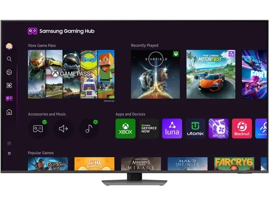 Sous Tizen Smart TV, vous accédez aux services des opérateurs, à Samsung TV Plus, au navigateur web et à SmartThings. Les commandes vocales via Alexa intégrée et Bixby simplifient la recherche de contenus. Les fonctions TV to Mobile, Mobile to TV, Tap View et MultiView (jusqu'à 2 écrans) optimisent la productivité et le divertissement. Le WiFi et le Bluetooth facilitent l'association d'appareils, et Apple AirPlay offre un partage fluide depuis des terminaux compatibles.