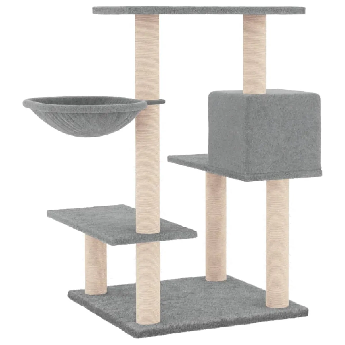 Commentaire vendeur : Gardez vos adorables chats amusés sans fin avec cet arbre à chat tout-en-un ! Tour pour chats tout-en-un : le mobilier pour chats à plusieurs niveaux est conçu avec une maison, un panier et plates-formes, offrant un endroit parfait pour que vos chats puissent grimper, se percher, se gratter, se cacher et aussi se détendre.Matériau moelleux et doux : la peluche très épaisse et douce est bien ventilée, résistante aux rayures, super confortable et chaude.Poteaux en sisal naturel : les poteaux en sisal naturel, résistants et solides de l'arbre à chat, sont parfaits pour que vos chats adorés puissent satisfaire leur instinct de grattage et évitent qu'ils n'endommagent pas vos meubles.Couleur : gris clairMatériau : bois d'ingénierie, peluche, sisalDimensions : 72,5 x 59,5 x 82,5 cm (L x l x H)L'assemblage est requis
