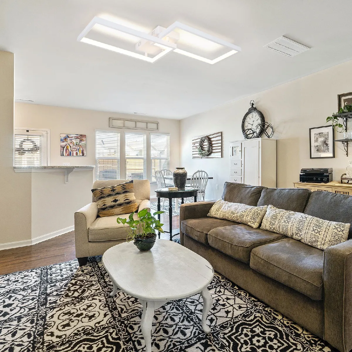 Protection des yeux et sans scintillement : l'éclairage LED avancé est exempt d'interférences RF et émet une lumière vive et douce qui protège vos yeux. L'abat-jour spécialement traité atténue encore plus la lumière. L'indice de rendu des couleurs du plafonnier est >80, ce qui garantit un rendu des couleurs clair et restitue les vraies couleurs de la vie. Taille du plafonnier : 60*29*7 cm ; Taille de la plaque de plafond : 19*10*3 cm ; Tension : 230 V