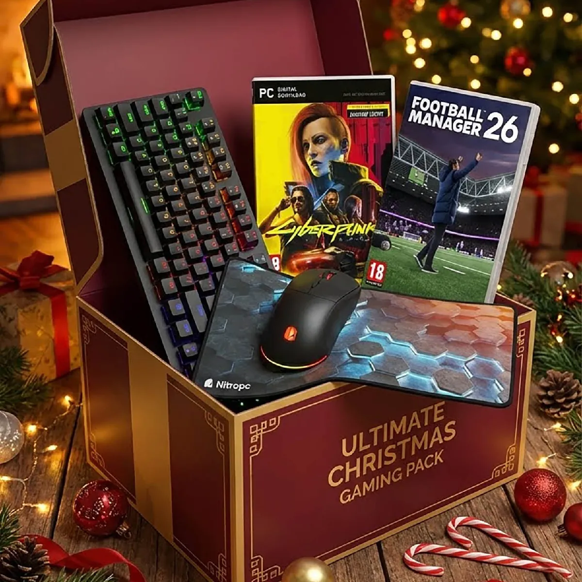 Grâce à notre pack de Noël exclusif, disponible uniquement pendant ces fêtes, ton achat inclut deux jeux AAA, notre célèbre clavier mécanique NK100, notre souris sans fil NM1 et notre tapis de souris XXL NMP1, pour une valeur de plus de 200 euros. Parmi les titres disponibles, tu trouveras des mondes ouverts comme Red Dead Redemption 2, des RPG comme Elden Ring, des jeux de tir narratifs comme Cyberpunk 2077: Ultimate Edition, des jeux de conduite comme Forza Horizon 5, des simulations de gestion comme Planet Zoo: Deluxe Edition, des jeux de sport comme NBA 2K26, des jeux de combat comme TEKKEN 8, des jeux dhorreur de survie comme Silent Hill 2 et des expériences coopératives comme It Takes Two, entre autres. Nous te contacterons depuis Nitropc pour que tu choisisses les jeux.
