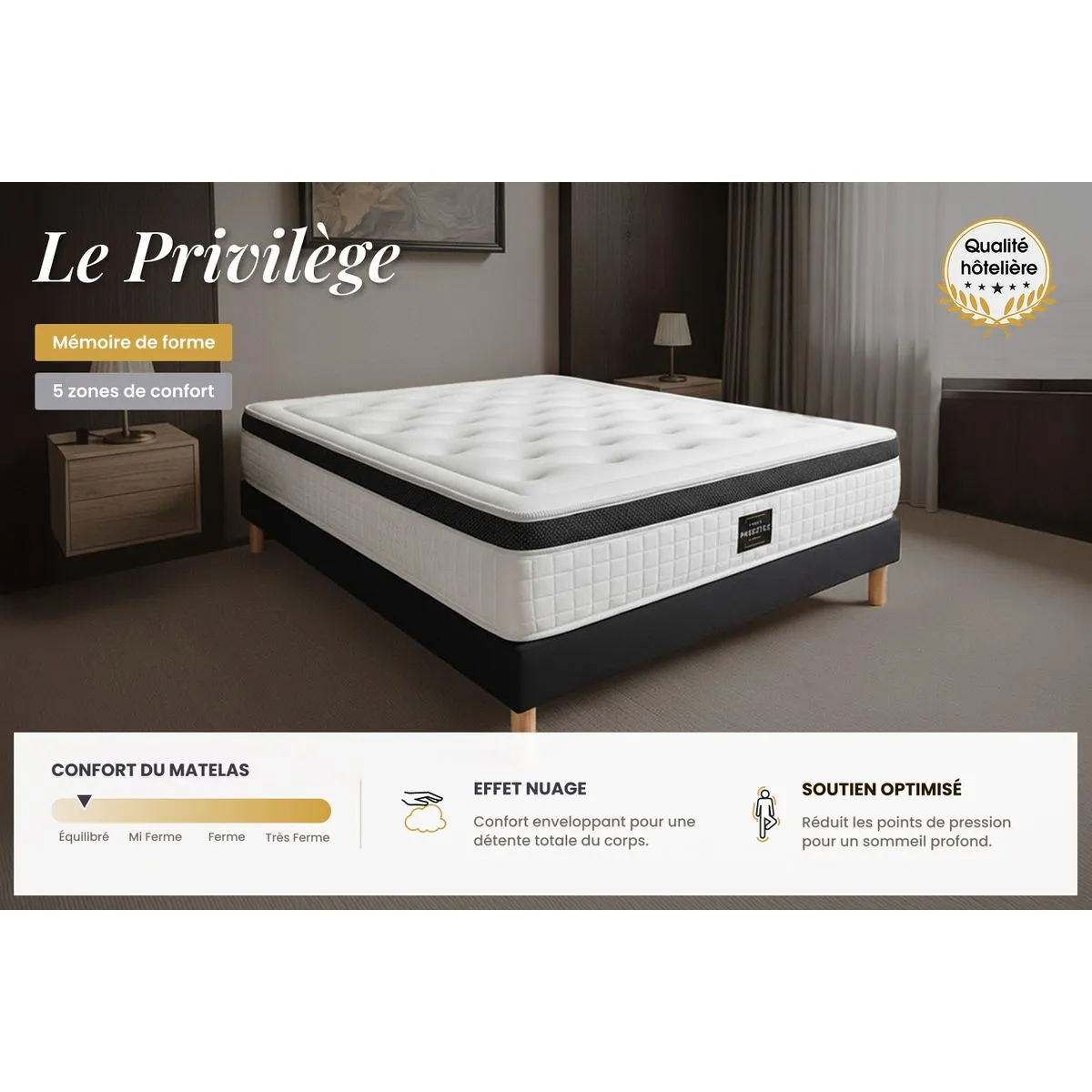 Le matelas Privilège bénéficie des dernières innovations en matière de mousse à mémoire de forme. D'un confort équilibré, son accueil moelleux s'adapte à votre morphologie et allège les points de pression.