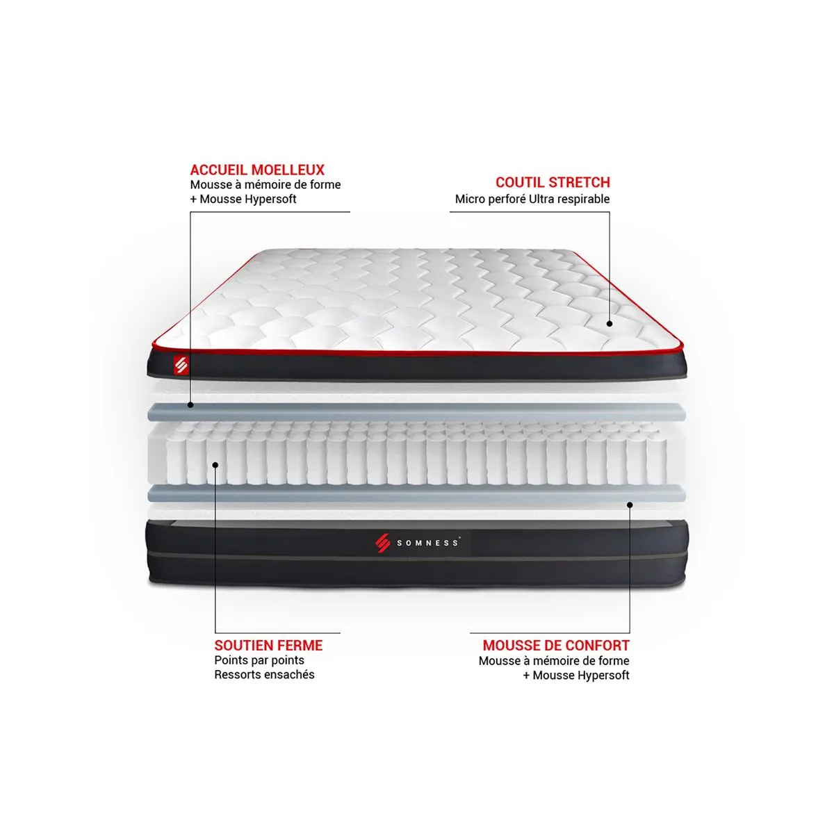 Commentaire vendeur : - Type de matelas : Mémoire de forme et ressorts ensachés- Epaisseur : 26 cm- Confort : Equilibré- Accueil : Moelleux avec 4cm mousse polyuréthane à mémoire de forme + mousse soft pour les 2 faces- Soutien : 348 Ressorts ensachés- Indépendance de couchage : Excellente- Zone de confort : 7 zones de confort- Coutil 100% polyester micro perforé ultra-respirable- Plate-Bande en tissu 3D micro-perforé 100% Polyester pour optimiser l'aération du matelas- Face de couchage : Face été / Face hiver- Densité : 55 kg/m3- Certification : Oeko-Tex