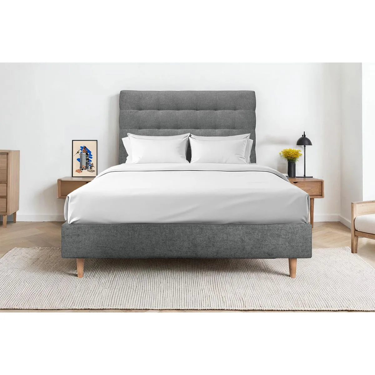 La structure en bois offre une base fiable, tandis que le capitonnage en tissu assure une surface d'appui douce avec une esthétique anthracite qui unifie le coin nuit. La hauteur de 120 cm crée un repère visuel net derrière le lit et améliore le confort d'adossement. Avec 10 cm d'épaisseur, la tête de lit présente une stabilité au sol et un maintien confortable pour les usages quotidiens. Le style design met en valeur la literie sans surcharge, pour un rendu discret et coordonné.