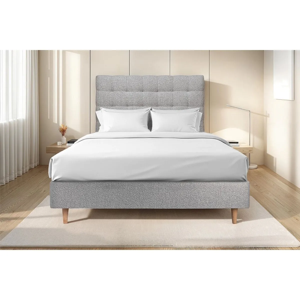 La surface en bouclette offre une matière enveloppante et agréable au toucher, idéale pour s'adosser. Le capitonnage régulier structure l'ensemble et renforce l'allure décorative sans surcharge. La couleur grise s'intègre à des parures claires ou foncées, créant un contraste discret. L'ensemble contribue à un rendu visuel homogène, compatible avec des ambiances épurées ou plus chaleureuses.