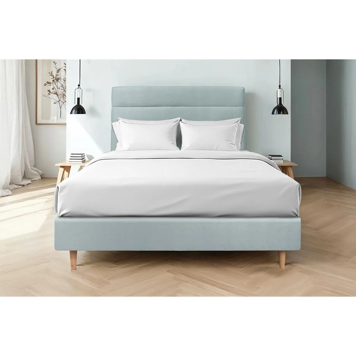 La structure en bois massif d'une épaisseur de 20 cm renforce la tenue du cadre et aide à conserver l'alignement du couchage au fil du temps. Le sommier tapissier intégré assure un soutien homogène sur toute la surface, utile pour limiter les points de pression et stabiliser la literie. La tête de lit à lignes verticales crée une surface d'appui confortable pour lire, tout en offrant une présentation soignée en bleu gris qui s'intègre dans de nombreux décors.
