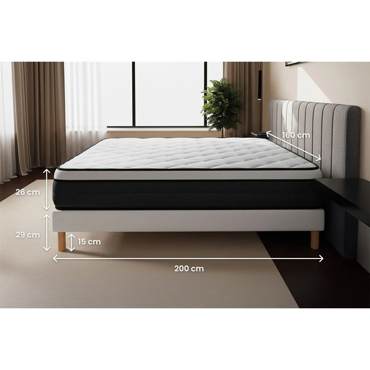 Commentaire vendeur : MATELAS• Type de matelas : Mémoire de forme et ressorts ensachés• Epaisseur : 26 cm• Confort : Equilibré• Accueil : Enveloppant avec 4 cm de mousse polyuréthane à mémoire de forme + hypersoft• Soutien : Equilibré point par point composé de ressorts ensachés• Indépendance de couchage : Excellente• Coutil 100% polyester• Densité : 55 kg/m3• Certification : Oeko-TexSOMMIER• Type de sommier : Tapissier à lattes• Épaisseur :14 cm• 2x12 lattes en peuplier massif• Structure et traverses de renfort en peuplier massif• Garnissage fibres 100% polyester 260 G/M2• Plate bandes Tissu Maille 100% polyester 260G/M2• Toile de fond anti-poussières 100% polyester• Pieds : 15cm fournis