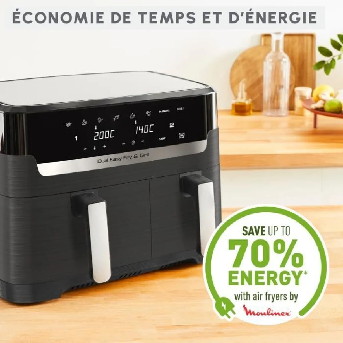 Deux espaces de cuisson indépendants permettent de préparer simultanément des recettes différentes pour le même repas, sans surveiller chaque étape. La MOULINEX Dual Easy Fry&Grill EZ905B20 associe une circulation d'air chaud performante et une surface de grill pour obtenir des résultats homogènes. Avec une capacité totale de 8,3 l adaptée jusqu'à 6 personnes, elle accueille des portions familiales. Les 8 programmes automatiques simplifient le choix des réglages selon le type d'aliment. Les éléments amovibles passent au lave-vaisselle pour un nettoyage pratique. Non connectée et sans minuteur intégré, elle reste simple à utiliser au quotidien. La plage de température montée jusqu'à 200 °C couvre les cuissons les plus courantes.
