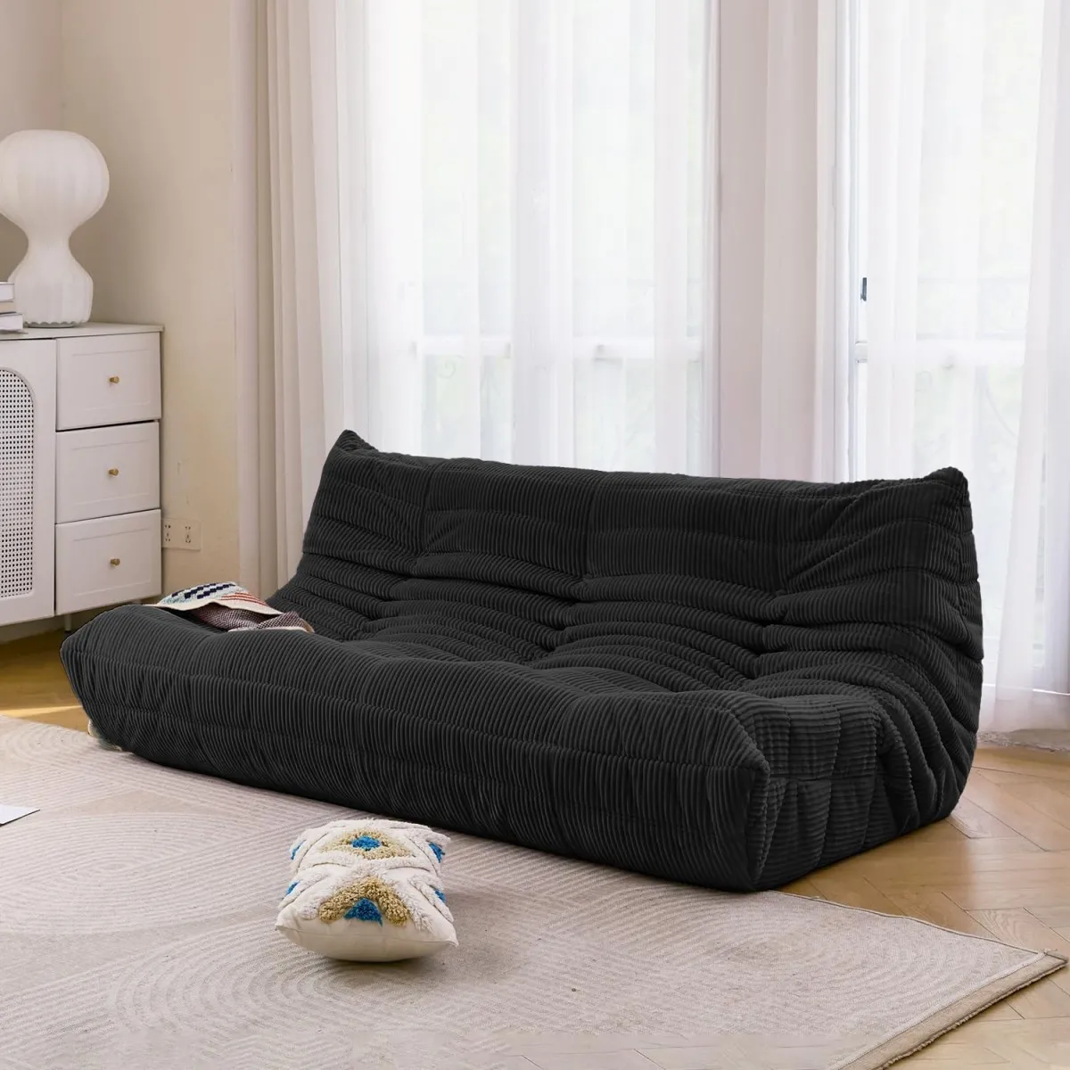 SoftEva canapé trois places noir sans assemblage, mousse double confort, soutien ergonomique du corps entier |