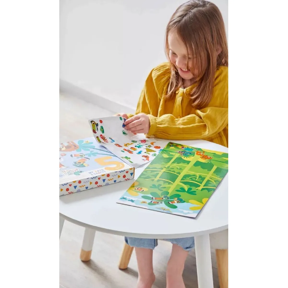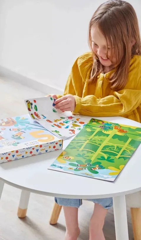 Les enfants composent 3 décors et 2 tableaux colorés grâce à des gommettes variées, pensées pour des mains débutantes. Les petits autocollants aident à développer la motricité fine et la coordination tout en s'amusant avec des animaux. La boîte devient un chevalet grâce à la Clever Box convertible en support, pratique pour installer l'activité puis exposer les créations à la maison. Comptez environ 1 h 30 pour une réalisation complète, idéale pour un temps calme et structuré.