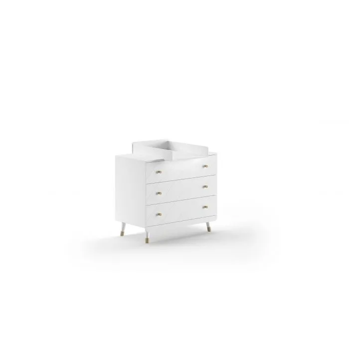 La finition blanche uniforme met en valeur le motif graphique contrasté et les pieds dorés, pour une présence visuelle discrète qui reste chaleureuse. La matière en MDF laqué blanc de haute qualité offre une bonne stabilité et une surface régulière, adaptée aux gestes de change répétés. Le plan à langer amovible permet de transformer l'ensemble en commode classique quand le besoin évolue, sans modifier l'esthétique.