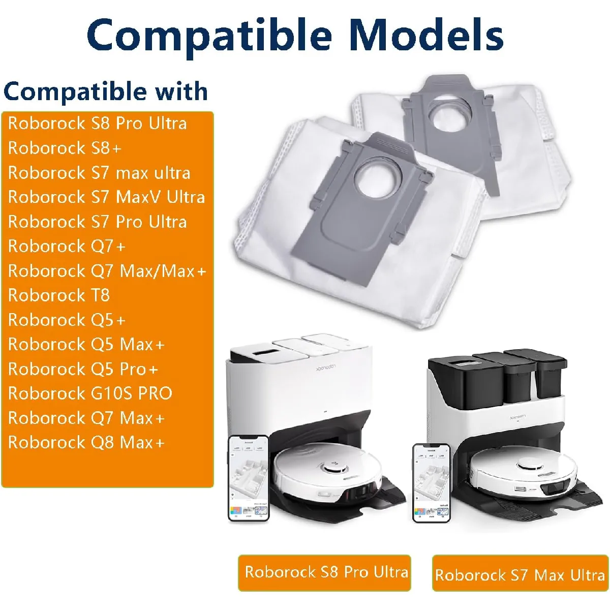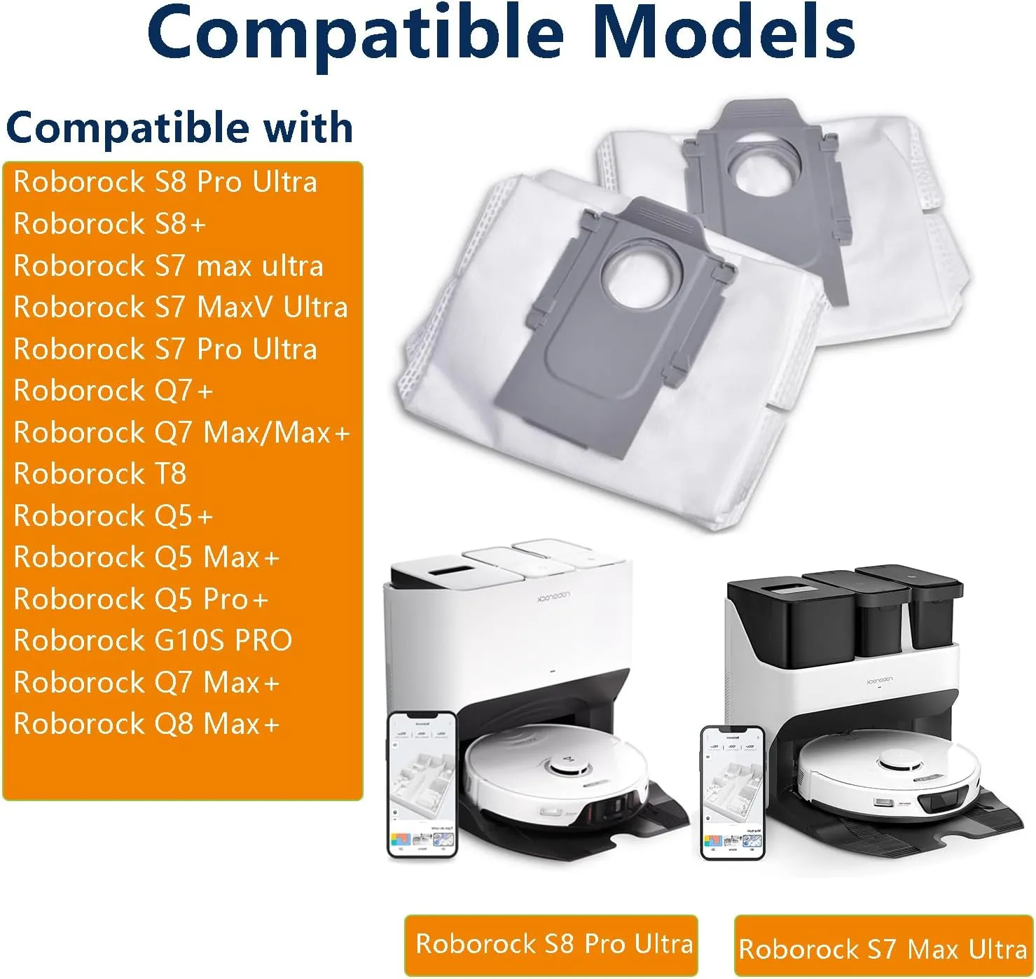 La compatibilité couvre les robots Roborock S8, S8+, S8 Pro Ultra, S7 MaxV Ultra, S7 Pro Ultra, Q7+, Q7 Max+, T8, Q5+, G10S Pro, Q7 Max+ et Q8 Max+, pour des performances stables sur plusieurs références Roborock. Le matériau en tissu non tissé favorise une rétention régulière des particules, et le lot de 14 sacs permet une gestion continue des remplacements sur une longue période d'utilisation.