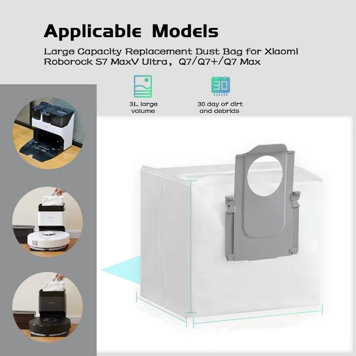 Chaque sac de 3 litres permet une collecte efficace des poussières pour les robots aspirateurs Xiaomi Roborock S7 MAXV Ultra, S8, S8 Pro S8+, T8, Q7, Q7 MAX et Q7 MAX+. La conception étanche limite les fuites de particules, tandis que la structure en ABS et non-tissé résiste à l'usage régulier. Le format 18,7 x 15 cm s'insère dans les stations compatibles, pour un maintien stable et une aspiration régulière. Le lot de 10 assure une réserve pratique, adaptée aux cycles d'entretien prolongés sans interruption du nettoyage.