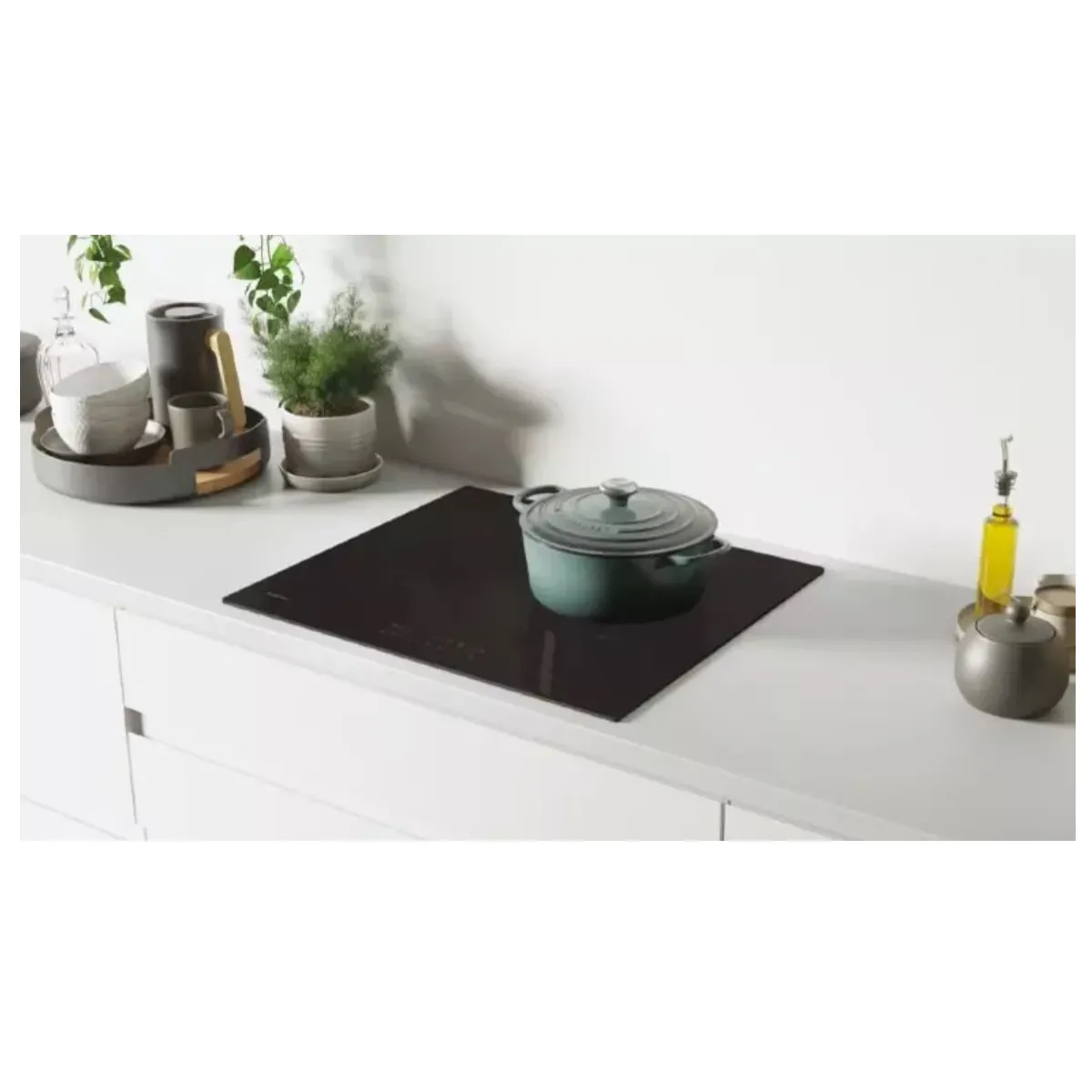 La table propose une prise en main rapide grâce au contrôle central aux touches sensitives. Toutes les fonctions sont accessibles en façade pour ajuster la puissance sans détour. Le format domino de 28 cm de large s'associe aisément à d'autres modules ou remplace une ancienne table étroite. L'encastrement à recouvrement permet une pose nette sur le plan de travail, tandis que la surface vitrocéramique noire uniforme assure une zone de cuisson plane et facile à essuyer.