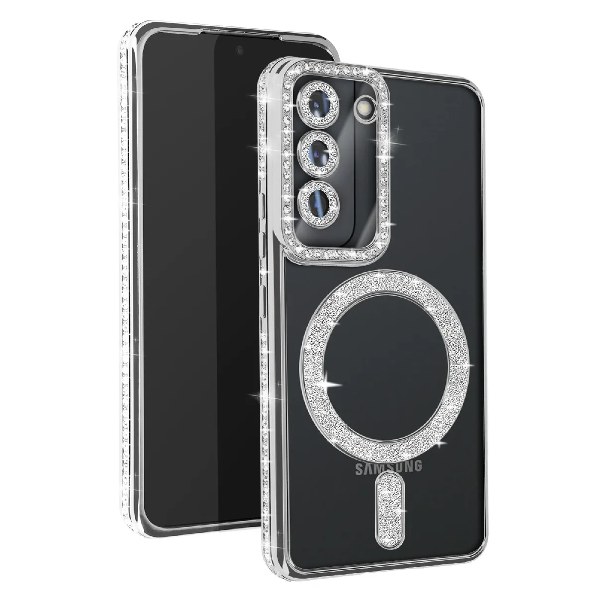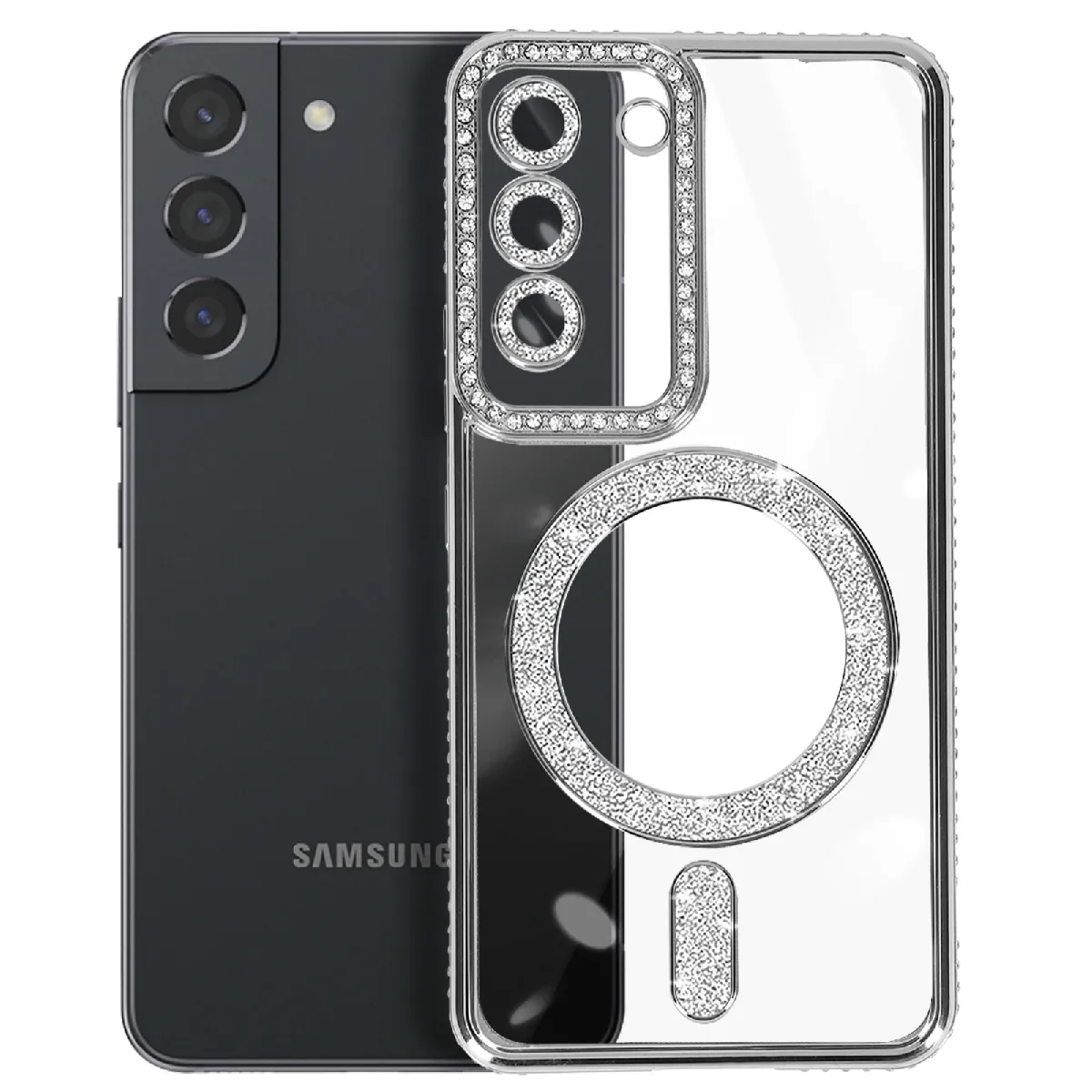 Coque diamant pour Samsung Galaxy S22 au contour strass très élégante et unique. Conception résistante avec bloc caméra protégé. Dos transparent. Cercle magnétique compatible accessoires MagSafe. Fonctions accessibles. Boutons latéraux redessinés.