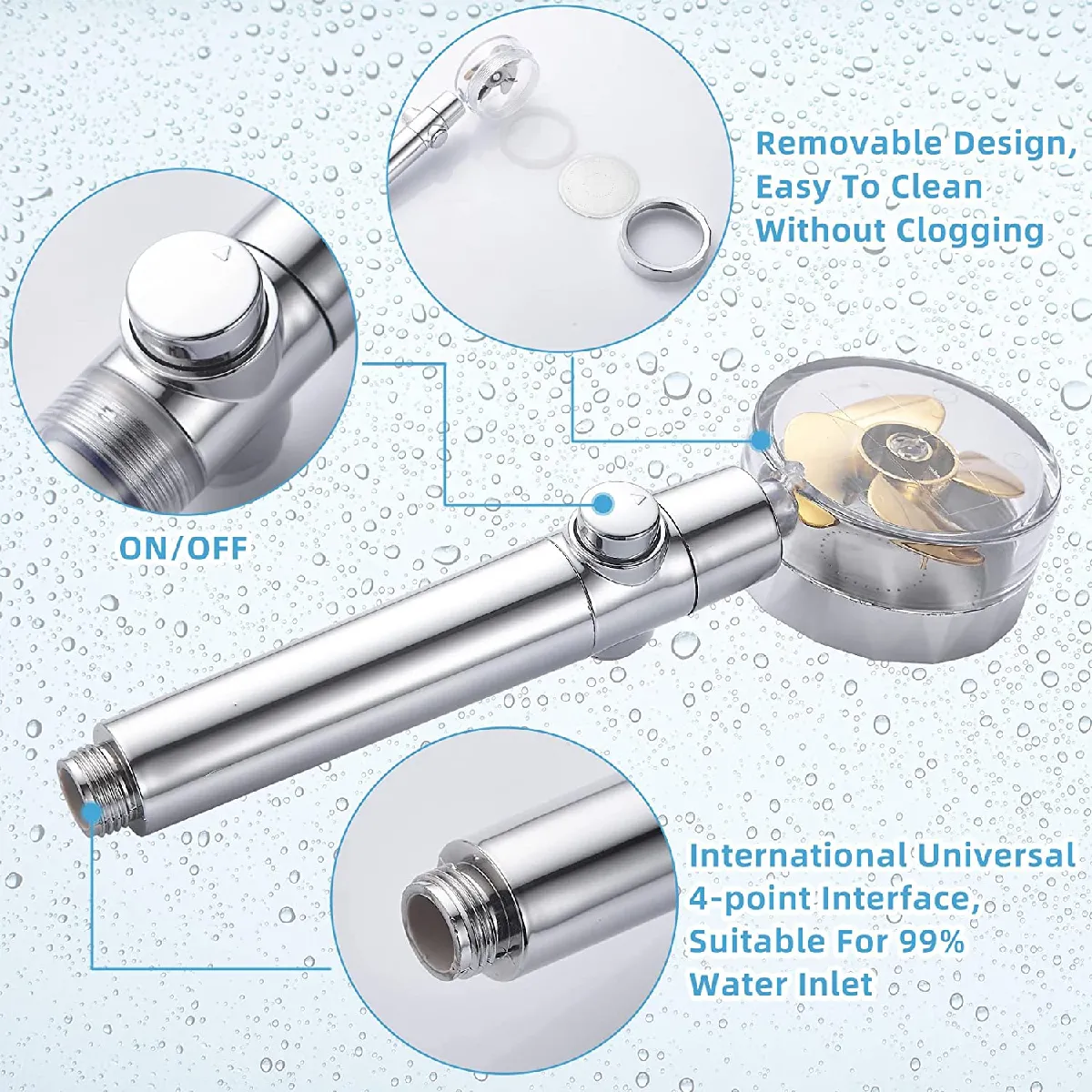 Douche à économie d'eau : Le ventilateur turbo dans la pomme de douche fournit une pression maximale, de sorte que la douche utilise 40 % d'eau en moins qu'une douchette ordinaire. C'est l'hélice qui génère la pression et non le volume d'eau. Parfaite pour les maisons à faible pression d'eau.