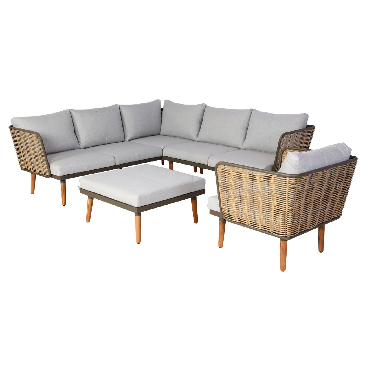 Un agencement en angle optimise l'espace et crée une zone de détente conviviale pour 7 personnes sur terrasse, balcon ou jardin d'hiver. L'ossature en acier thermolaqué et polyrotin décoratif assure une tenue rigoureuse au quotidien, tandis que les housses hydrofuges permettent à l'eau de perler et se nettoient d'un simple geste. Les coussins d'assise et de dossier, à épaisseur de rembourrage accrue, améliorent la tenue sur la durée d'utilisation. Le montage est direct : seuls les pieds sont à visser, avec protections de sol réglables en hauteur pour compenser les irrégularités. La teinte or et gris s'intègre facilement et s'accorde avec des accessoires extérieurs variés.