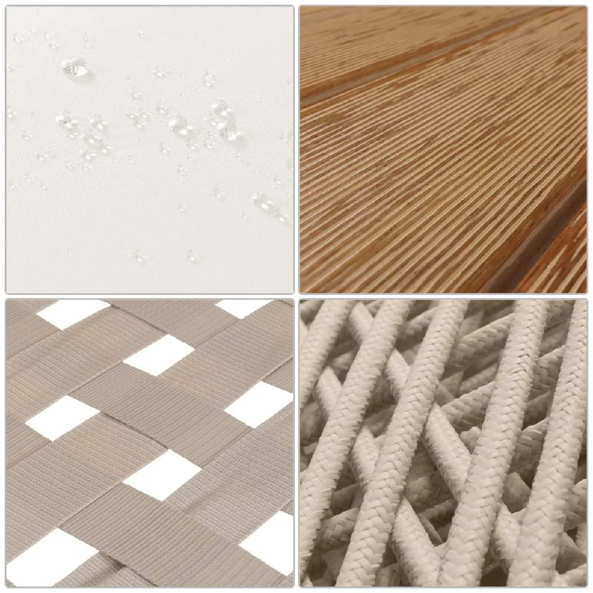 La combinaison de bois d'acacia et de corde en maille élastique assure une assise souple et un maintien agréable. Les coussins généreux, avec garnissage en mousse, créent une sensation d'accueil pour des pauses prolongées. Les housses en polyester 230 g/m² sont hydrofuges et se retirent facilement pour le nettoyage, simplifiant l'entretien après une averse légère ou une utilisation fréquente. Des protections de sol sont intégrées pour stabiliser les éléments et préserver la surface du balcon.