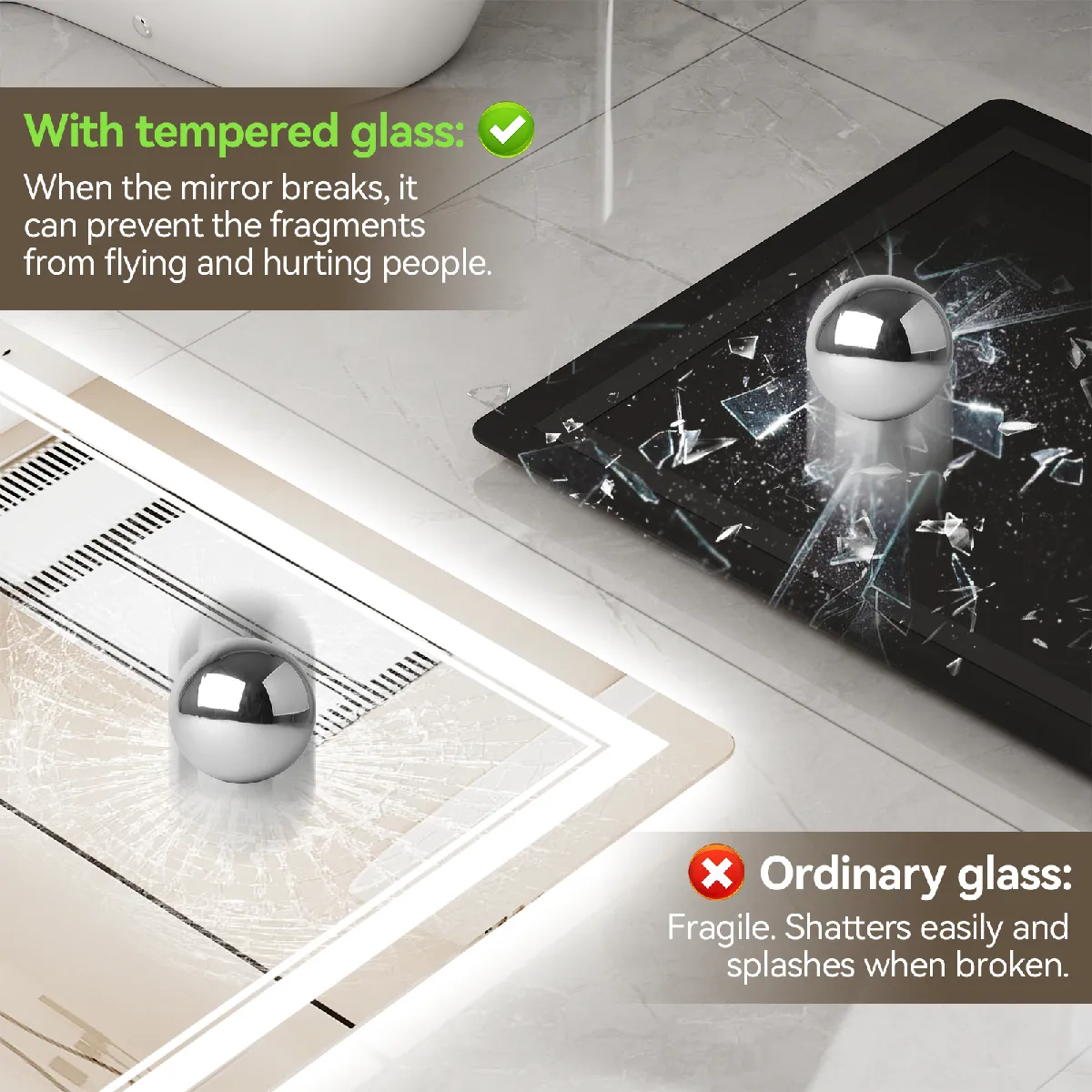 Étanchéité IP44 : la conception étanche IP44 empêche efficacement les dommages causés par les éclaboussures d'eau, garantissant une utilisation sûre dans les environnements humides de la salle de bain et prolongeant la durée de vie du miroir.