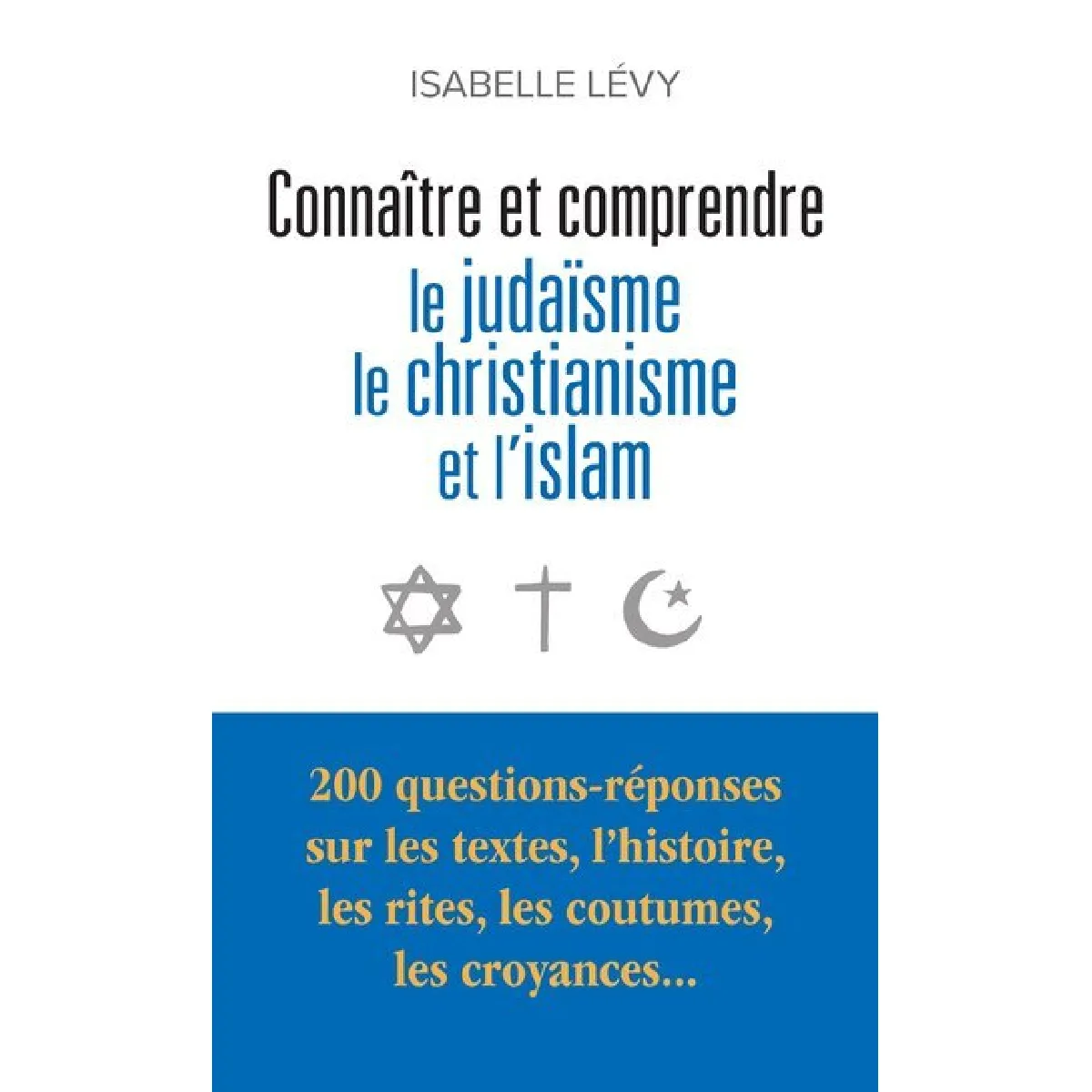 Quatrième de couverture : Connaître et comprendre le judaïsme, le christianisme et l'islam Pourquoi un juif se couvre-t-il dans une synagogue alors qu'un chrétien se découvre dans une église ? Pourquoi est-il interdit de consommer du porc ? Sur quels principes reposent la circoncision et le baptême ? Quelles différences entre Halakha, droit canon et charia ? Qu'est-ce que la Kabbale ? Où se trouve l'arche de Noé ? Le plaisir sexuel est-il sacré ? En répondant à près de 200 questions, Isabelle Lévy explique avec clarté les origines, l'histoire, les dogmes, les croyances, les rites, les pratiques des trois religions monothéistes, et en expose avec clarté les convergences et les divergences. Elle aborde également de nombreux thèmes en résonance avec l'actualité, tels l'euthanasie, l'interruption de grossesse ou le don d'organes. En remontant aux sources des traditions religieuses et en s'appuyant sur de nombreux entretiens avec des spécialistes des trois religions, elle montre aussi que juifs, chrétiens et musulmans partagent de nombreuses valeurs communes.