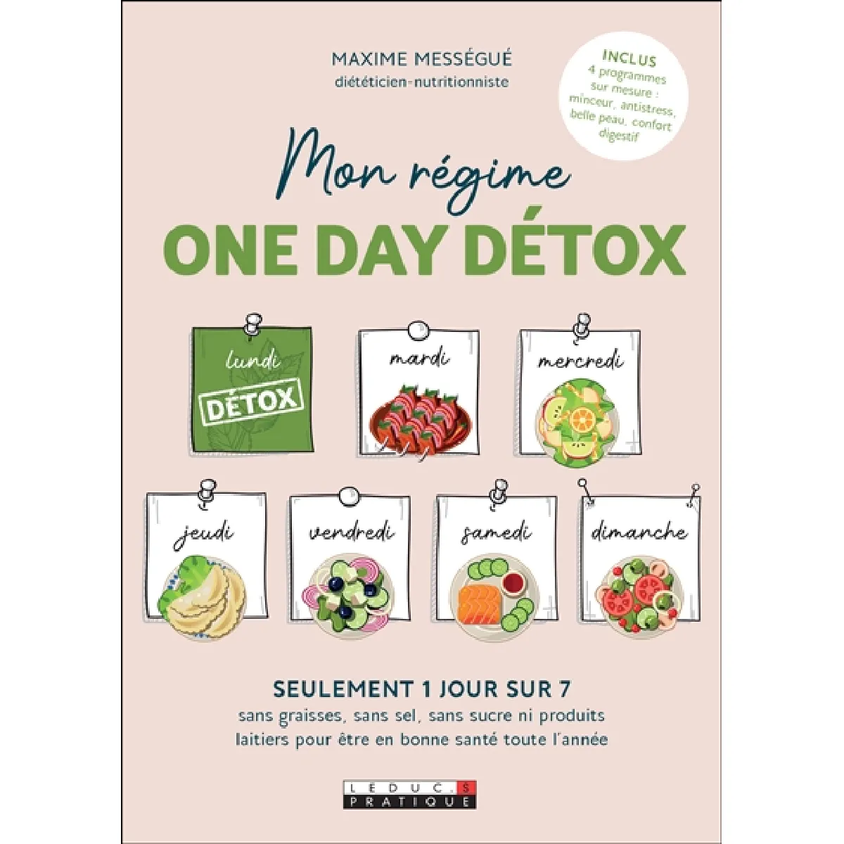 Quatrième de couverture : La méthode 1/7 Un jour et un seul jour par semaine : c'est le secret de la méthode One day détox, qui permet de perdre du poids et atteindre un équilibre durable tout en prenant soin de sa santé. Le tout sans frustration. L'idée est simple : consacrer une journée par semaine à une cuisine la moins transformée possible et faire appel aux coups de pouce offerts par la phytothérapie via des infusions et des recettes naturelles. Découvrez dans ce livre : La méthode One day détox, une journée pour tout changer : son fonctionnement, les aliments à adopter et ceux à proscrire, les bons gestes, les activités physiques à privilégier... 4 programmes One day détox sur mesure en fonction de ses objectifs : minceur, antistress, belle peau, bien dans son ventre. 50 recettes One day détox : bouchées apéro détox, velouté de céleri aux noix, carpaccio de betterave au sésame, poisson tandoori au fenouil, soupe froide de mangue aux amandes...