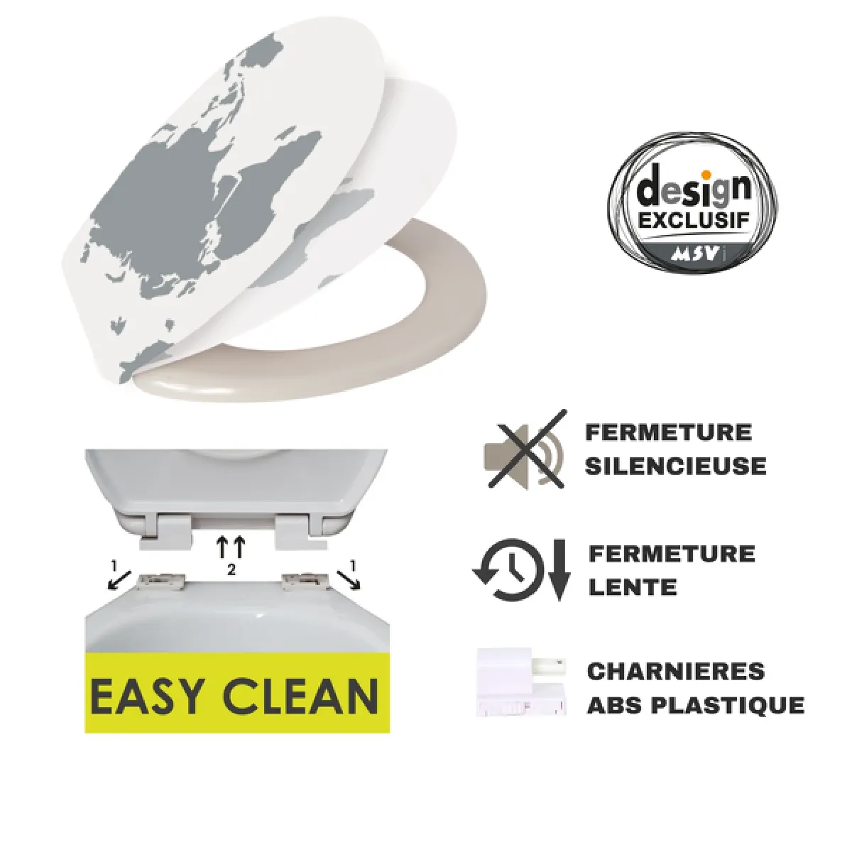 MSV Abattant Wc Thermo Dur WORLD Gris & Blanc - Charnières PS |