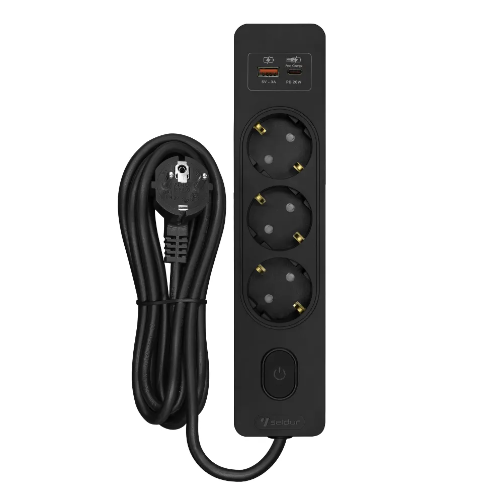 Multiprise 3 prises type F avec interrupteur - Ports USB A et C charge rapide - Protection enfant - Corps en polypropylène non inflammable - Contacts en laiton - Certification CE et TÜV
