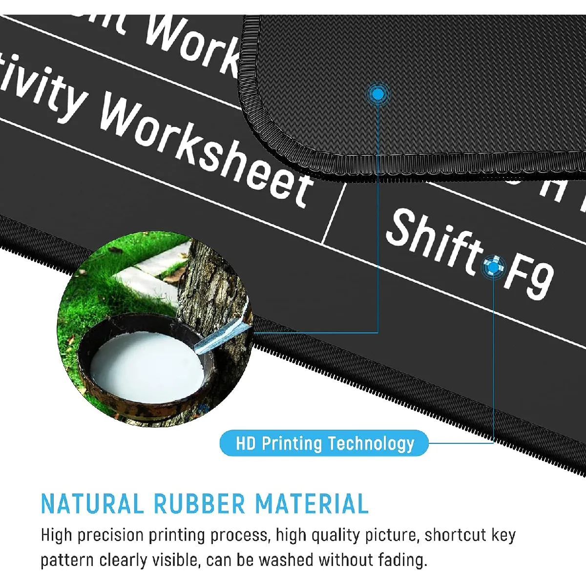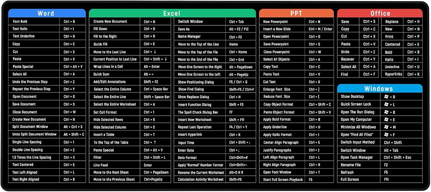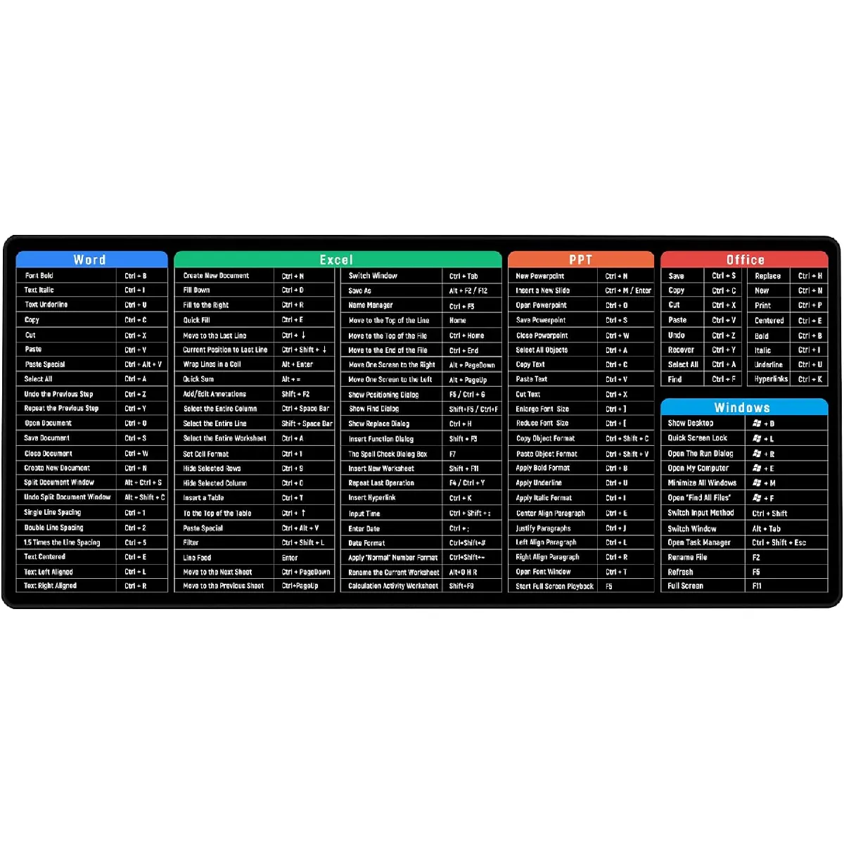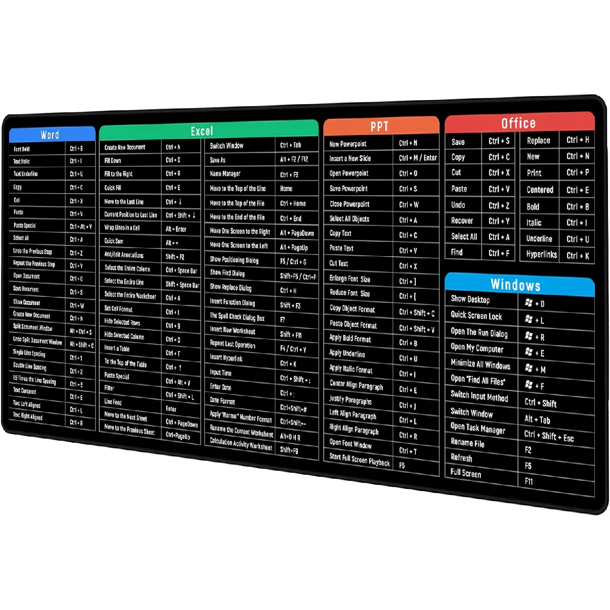 Le bureau gagne en clarté grâce à un grand format 80 x 30 cm qui accueille clavier, souris et ordinateur portable sans encombre. Les raccourcis Windows et Office imprimés offrent un repère immédiat pour accélérer les actions courantes. La surface tissée haute densité assure un suivi précis tout en restant agréable au toucher. La base en caoutchouc maintient le tapis bien en place, même lors de mouvements rapides. La teinte noire s'intègre facilement à tout environnement de travail et limite les distractions visuelles, que ce soit à la maison ou au bureau.