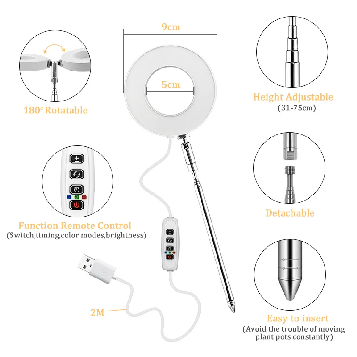 Lampe orientable pour plantes : Léclairage est ajustable à 360° et la perche télescopique peut être réglée en hauteur entre 31 et 75 cm. Vous avez le choix entre 3 températures de couleur et 9 niveaux dintensité lumineuse différents. De plus, la lampe reste froide et totalement sûre pour vos plantes.