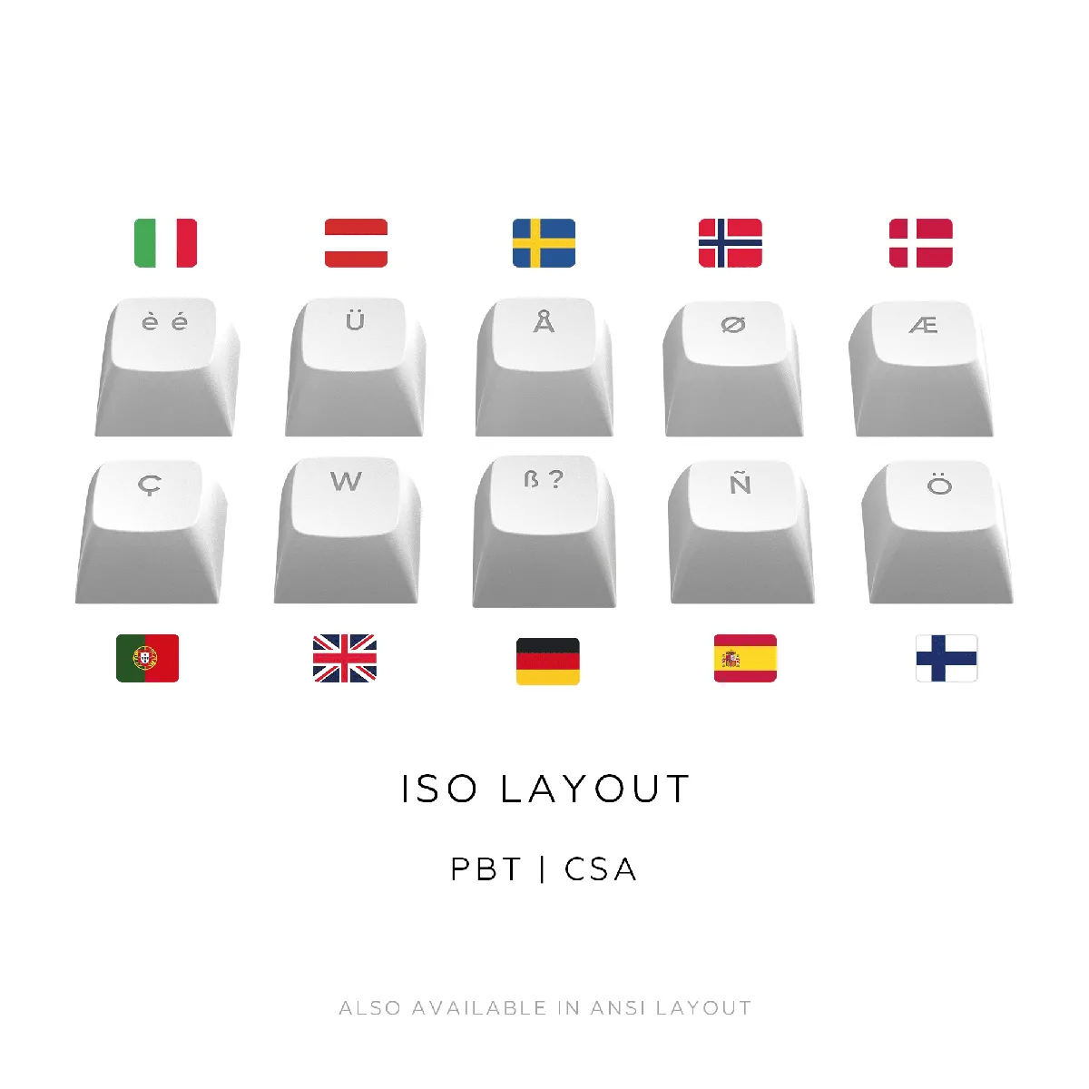 Les keycaps en ABS fabriqués en Double-Shot préservent des légendes nettes et durables, tout en laissant passer la lumière pour une lecture claire. Le profil CSA procure une hauteur et une courbure régulières qui favorisent la précision. La disposition ISO fournie en allemand est accompagnée de touches additionnelles pour AT/GB/ES/IT/FI/NO/SE/DK, utile pour adapter le clavier à votre langue ou remplacer une touche usée sans changer l'ensemble.