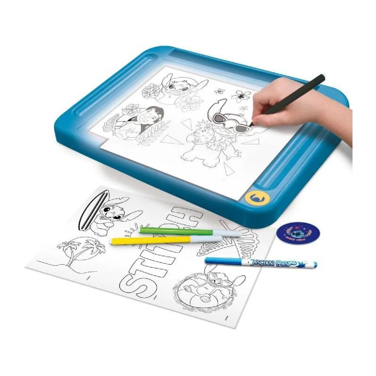 - Contenu du coffret : table lumineuse, modèles Stitch en noir et blanc, feuilles décorées, pochoirs (au moins 2), planches d'autocollants multiples, feutres colorés (au moins 6 dont des feutres parfumés), crayons de couleur, petite paire de ciseaux, jetons décoratifs et notice illustrée.