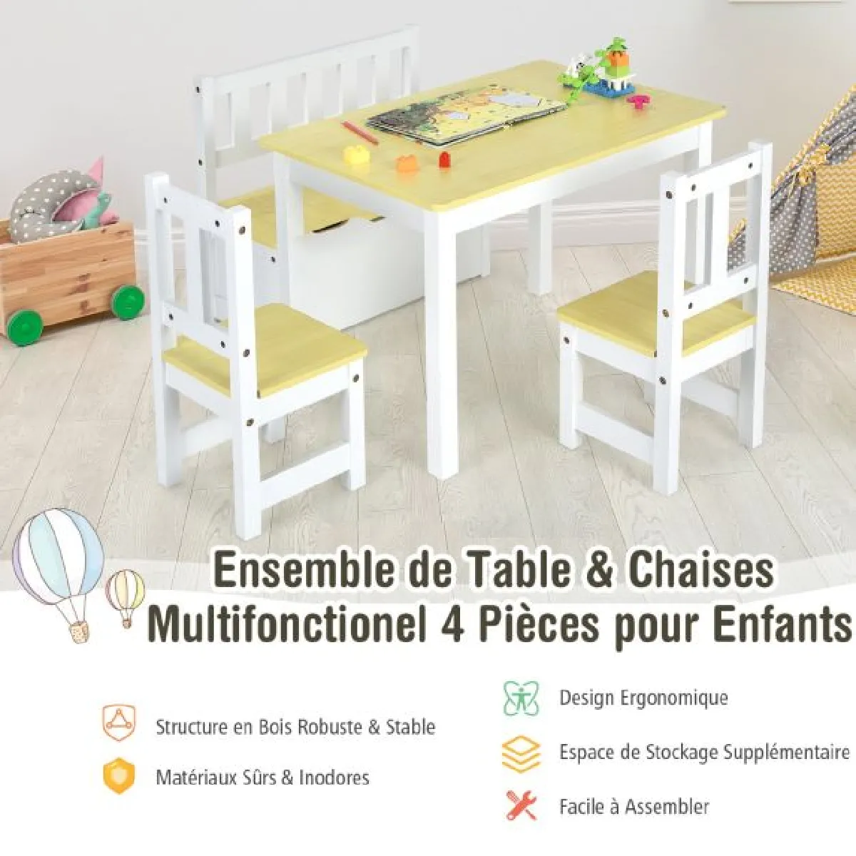 Ensemble table enfant en bois naturel avec chaises et banc de rangement