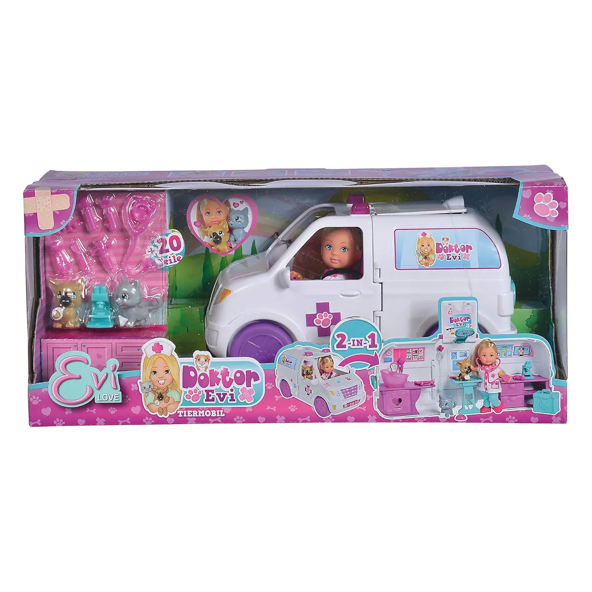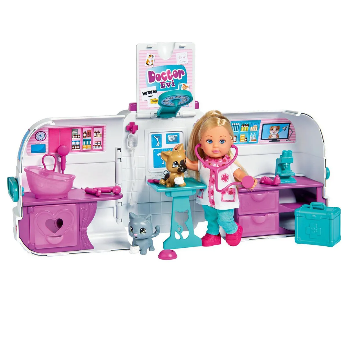 Set de jeu poupée vétérinaire - Bus transformable en salle d’opération - Accessoires inclus - Dès 3 ans - Matière plastique