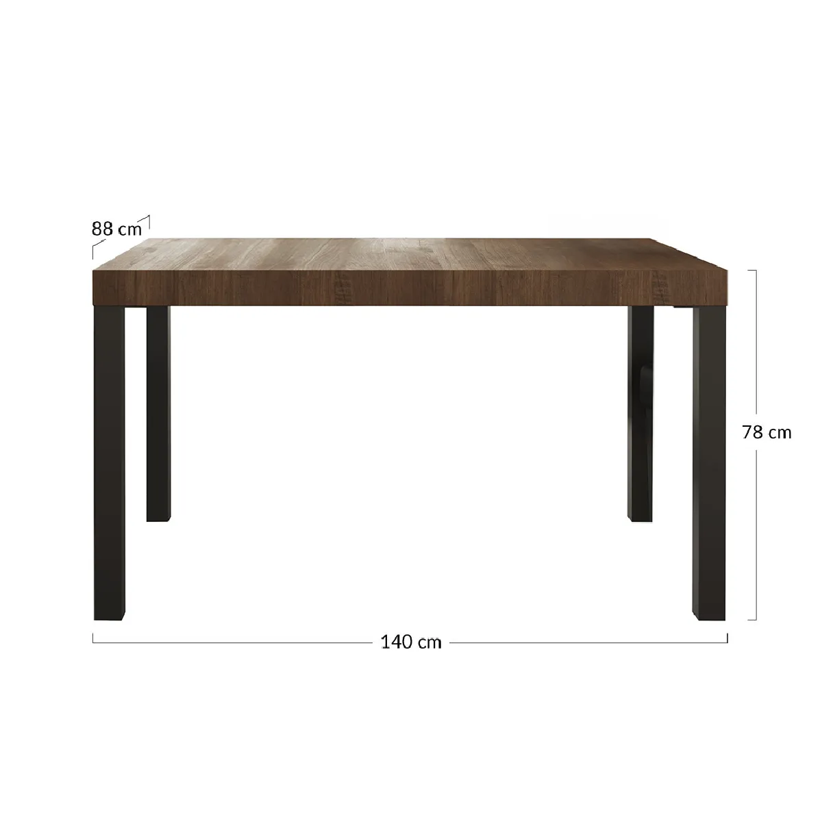 La géométrie rectangulaire optimise la circulation autour de la table et facilite l'agencement des chaises, tandis que la longueur de 140 cm et la largeur de 88 cm offrent un espace confortable pour la vaisselle et les plats au centre. La hauteur de 78 cm procure une posture assise naturelle, et les pieds en métal contribuent à la rigidité de l'ensemble. Le plateau en panneaux de particules présente une finition mate discrète et uniforme, utile pour limiter les traces visibles et préserver une apparence soignée.