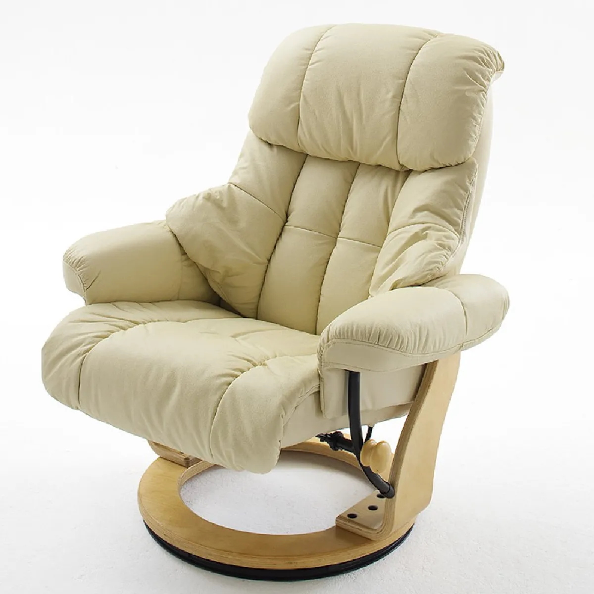 Le dossier inclinable à 135° et la rotation à 360° offrent une détente adaptée aux moments de lecture ou de pause. Le revêtement en cuir crème s'associe à une structure en bois couleur naturel pour une allure sobre et une sensation au toucher agréable. L'ensemble est livré avec un repose-pieds coordonné pour soulager les jambes et optimiser la position de relaxation. Le fauteuil se replie lorsque l'on manque d'espace, ce qui facilite le rangement au quotidien. L'assise ferme et le dossier plus souple équilibrent le maintien et l'accueil, pour un confort constant dans le salon.