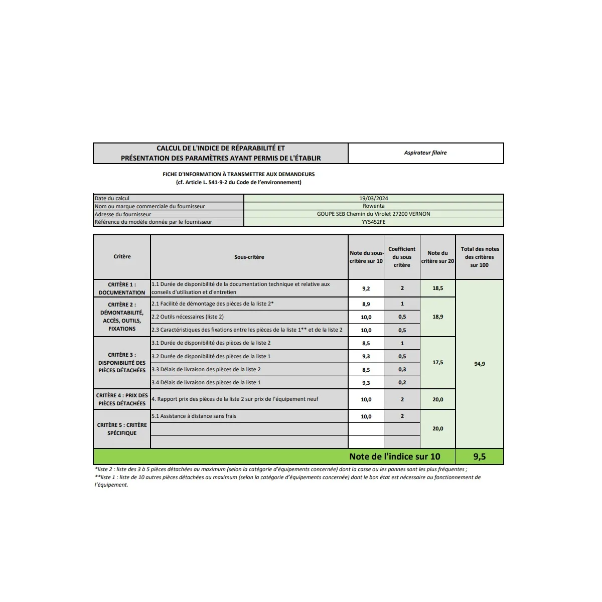 CALCUL DE L'INDICE DE RÉPARABILITÉ ET PRÉSENTATION DES PARAMÈTRES AYANT PERMIS DE L'ÉTABLIR (Rowenta - référence modèle YY5452FE) | |