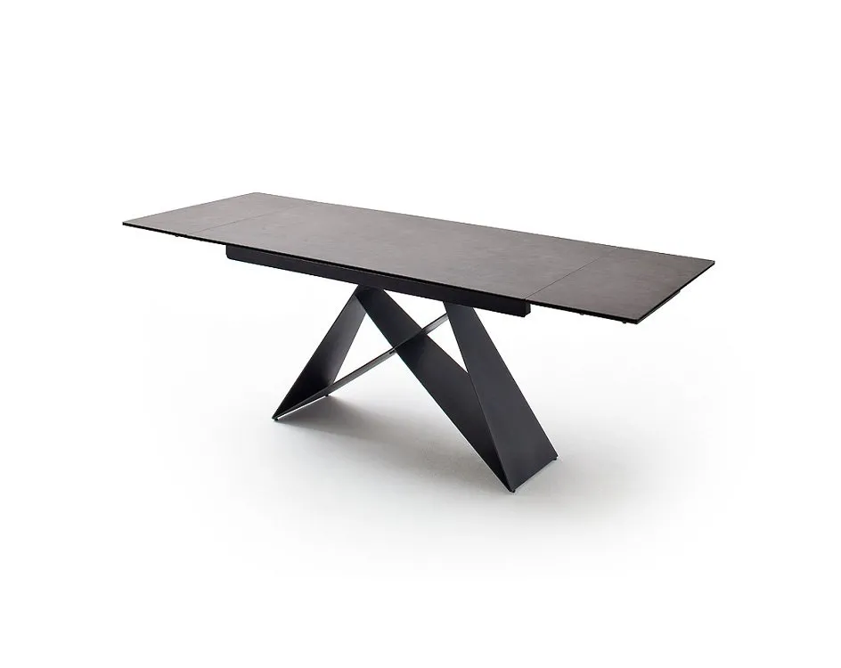 Le plateau en céramique gris sur verre sécurit offre une surface résistante et simple à entretenir, idéale pour un usage quotidien. Le mécanisme d'extension intégré avec deux allonges de 40 cm permet de passer rapidement d'un format familial à une configuration pour convives supplémentaires. Le piétement en métal laqué noir mat à la géométrie marquée assure une stabilité rigoureuse tout en apportant une présence visuelle nette dans la pièce. À 75 cm de hauteur, la table fournit une ergonomie confortable avec des chaises standard, tandis que la largeur de 90 cm laisse l'espace nécessaire pour plats et accessoires. L'ensemble compose une solution durable pour le séjour.