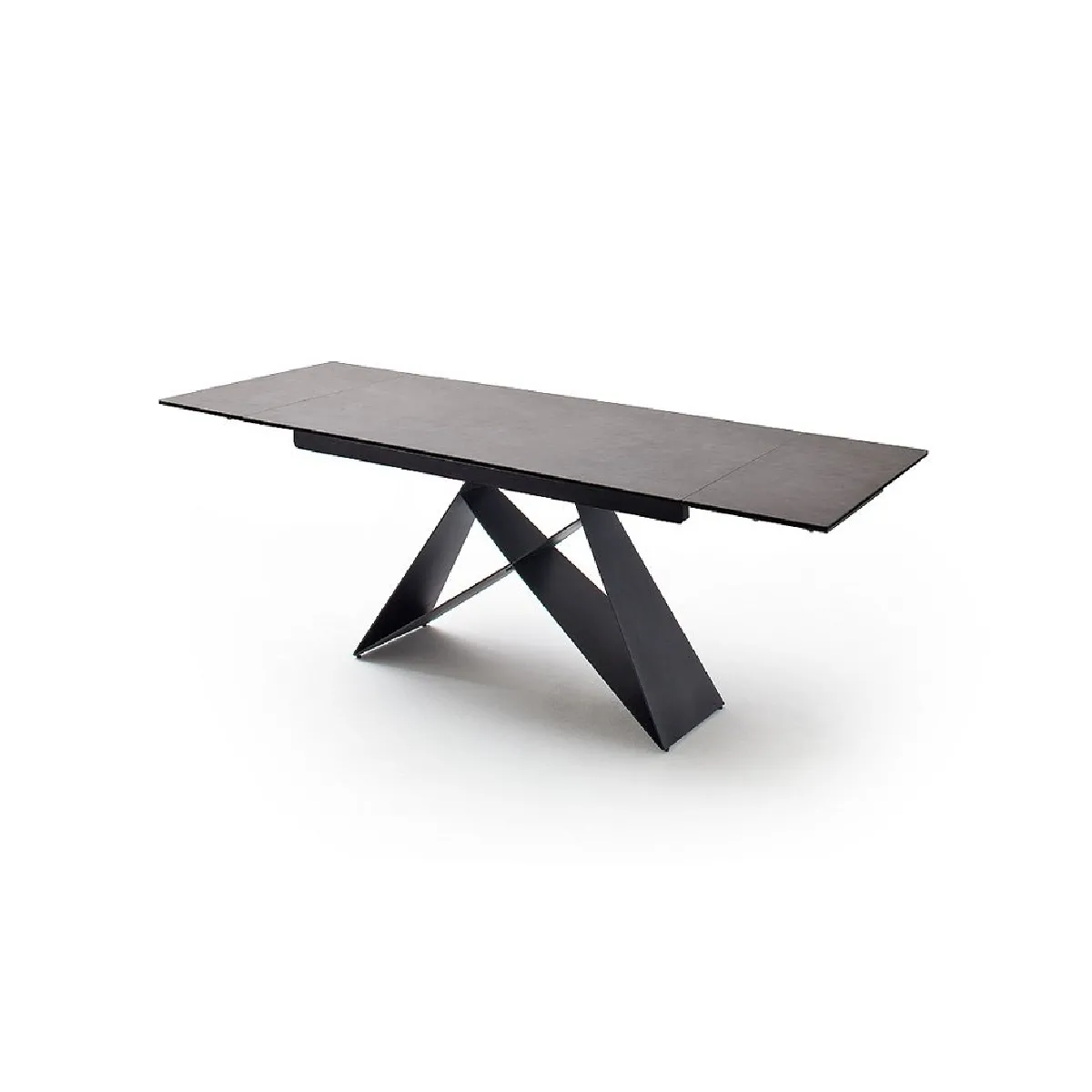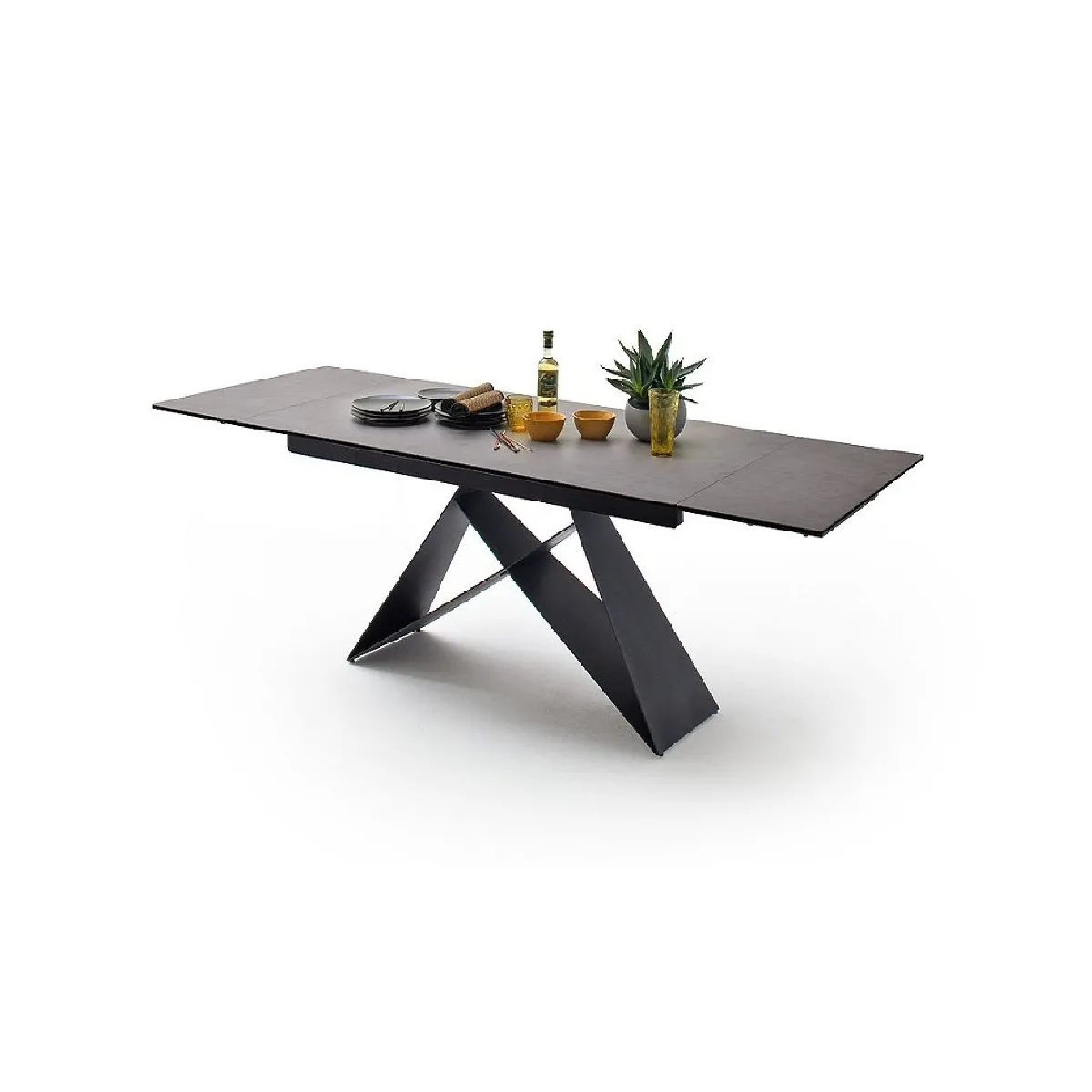 Le plateau en céramique anthracite sur verre sécurit de 13 mm résiste aux chocs du quotidien, à la chaleur modérée et aux rayures courantes d'un service de table. Son fini gris uniformise l'ensemble et facilite l'assortiment avec des assises ou un tapis de salle à manger. La structure en métal laqué noir mat soutient la surface sur toute la longueur, limitant la flexion et garantissant un appui stable sur différents types de sols. Chaque élément s'articule pour offrir une utilisation sans gestes complexes.