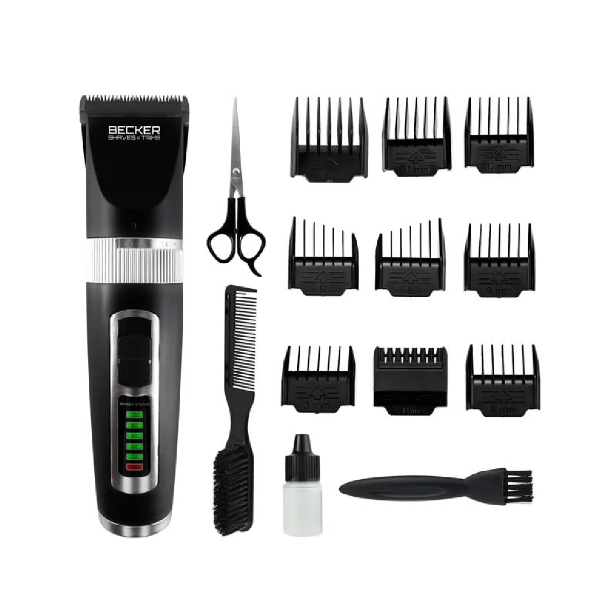 - Accessoires inclus : Mallette aluminium, cape, ciseaux, brosse 2-en-1, huile, chargeur